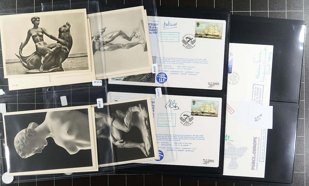 A group of Canada and Worldwide Covers, with roughly 200 primarily Canada covers, 1890's-1970's, neatly organized in 3 volumes. We note a wide variety of items including a few stampless and Small Queen covers, military mail (including various censor tapes and field post offices), first day covers, first flight covers, postcards, and more, with the roughly 40 worldwide covers containing the same type of material. Many of the items have been identified and priced (either retail or catalogue value), ranging from $5 to $20 and up each. A nice lot for cover collectors and dealers alike, overall fine to very fine. Estimate =