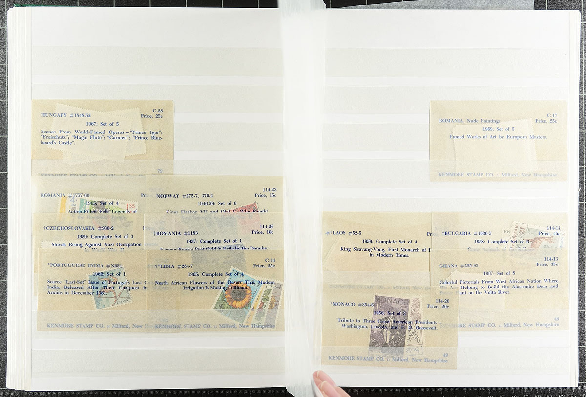 A worldwide "Back to the Future" lot of mint and used worldwide stamps, 1940s'-1970's, with many hundreds of stamps in a thick stockbook and loose material. The strength of the lot is the several hundred approval glassines, from the "Kenmore Stamp Co", containing mint and used singles and sets generally ranging from the 1940s to the 1970s, and probably purchased at some point in the 1970's. Original cost for most glassines range from 25c to $1.00 for a total of all glassines at $244.00 US (using 1975 as a base, adjusting for inflation, this is equivalent to $1,523.00 in 2026). A spot check of a few glassines indicated some material now cataloguing $5 to $10 each, with an original price at 50c to 75c each, leaving potential finds to dedicated collectors. The stockbook also contains several hundreds of used worldwide stamps on and off piece. A nice interesting lot, overall fine to very fine. Estimate =