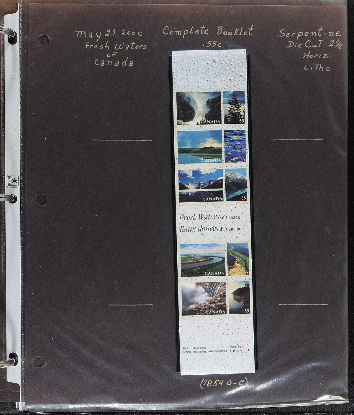 In-depth collection of primarily mint never hinged Canada, from January to June of 2000, covering Unitrade #s 1835-1857 all in hingeless mounts in over 50 well described pages, housed in a thick binder. The collection contains mint and used singles (including booklet stamps), multiples, matched set of plate blocks (including used sets), for most issues, along with a few souvenir sheets (mint and used), sheetlets, booklets (including used booklet panes), and first day covers. We note several match sets cataloguing $10.00 and up. Duplication up to 1 and up for a few issues. Face value alone totals $178.00. A nice comprehensive collection that would be difficult to duplicate. 2024 Unitrade =