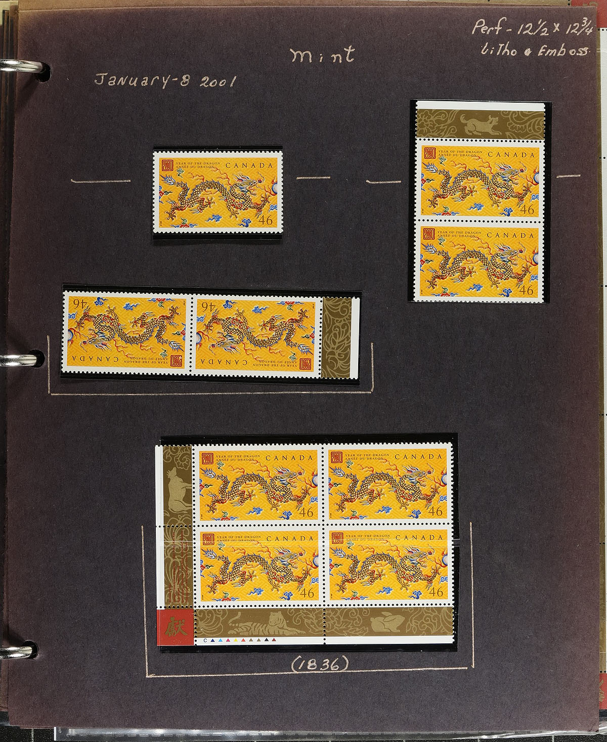 In-depth collection of primarily mint never hinged Canada, from January to June of 2000, covering Unitrade #s 1835-1857 all in hingeless mounts in over 50 well described pages, housed in a thick binder. The collection contains mint and used singles (including booklet stamps), multiples, matched set of plate blocks (including used sets), for most issues, along with a few souvenir sheets (mint and used), sheetlets, booklets (including used booklet panes), and first day covers. We note several match sets cataloguing $10.00 and up. Duplication up to 1 and up for a few issues. Face value alone totals $178.00. A nice comprehensive collection that would be difficult to duplicate. 2024 Unitrade =