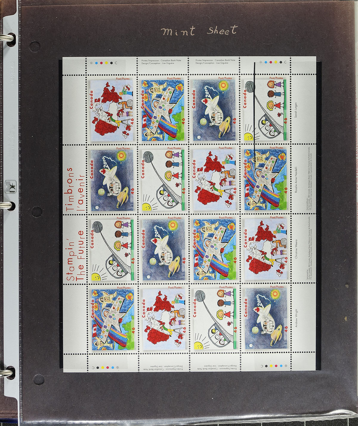 In-depth collection of primarily mint never hinged Canada, from June to December of 2000, covering Unitrade #s 1858-1872, 1876-1881 all in hingeless mounts in over 50 well described pages, housed in a thick binder. The collection contains mint and used singles (including booklet stamps), multiples, matched set of plate blocks (including used sets), for most issues, along with a definitive issues, few souvenir sheets (mint and used), sheetlets, booklets (including used booklet panes), and first day covers. We note several match sets cataloguing $10.00 and up. Face value alone totals $222.00. A nice comprehensive collection that would be difficult to duplicate. 2024 Unitrade =