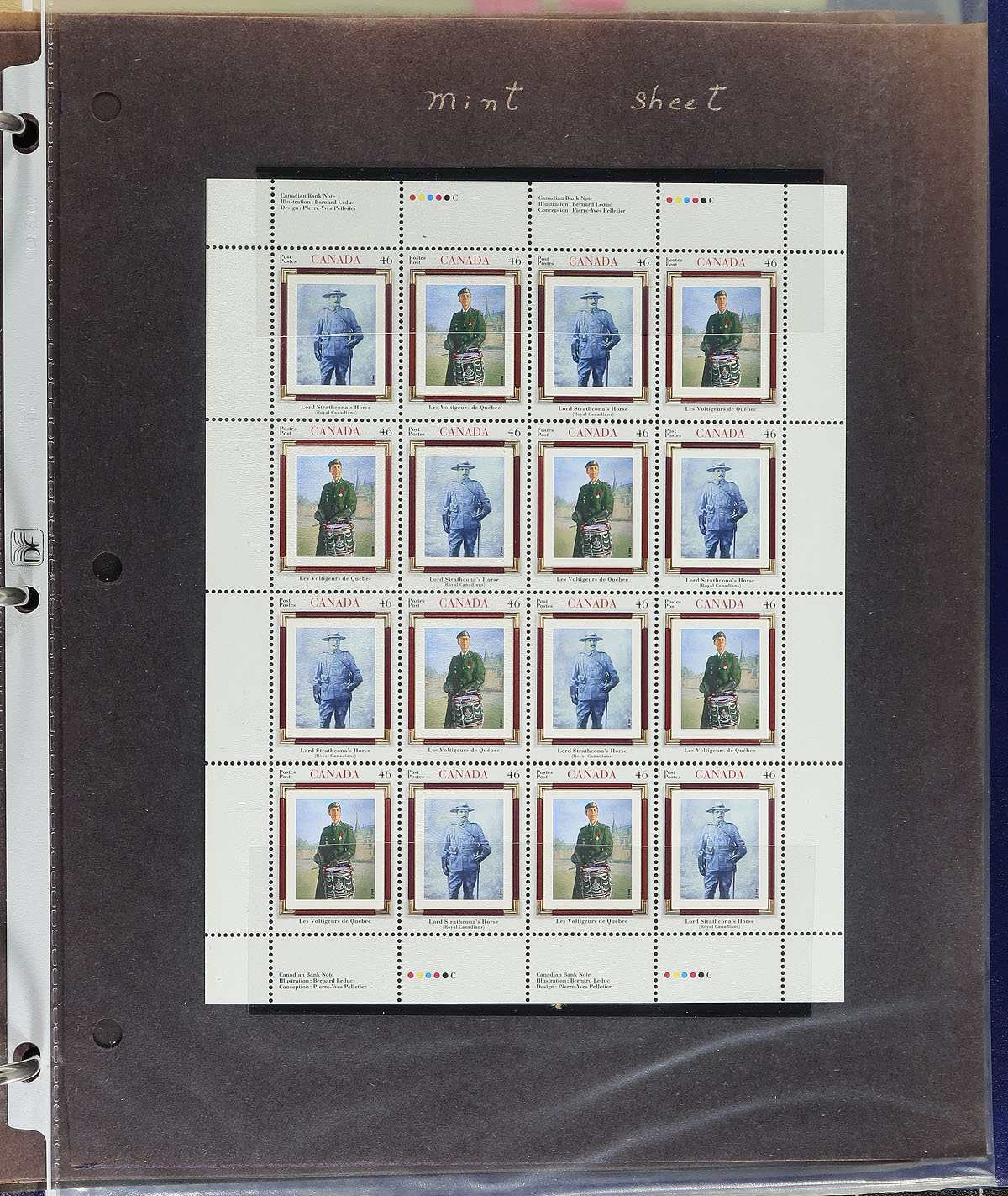 In-depth collection of primarily mint never hinged Canada, from June to December of 2000, covering Unitrade #s 1858-1872, 1876-1881 all in hingeless mounts in over 50 well described pages, housed in a thick binder. The collection contains mint and used singles (including booklet stamps), multiples, matched set of plate blocks (including used sets), for most issues, along with a definitive issues, few souvenir sheets (mint and used), sheetlets, booklets (including used booklet panes), and first day covers. We note several match sets cataloguing $10.00 and up. Face value alone totals $222.00. A nice comprehensive collection that would be difficult to duplicate. 2024 Unitrade =