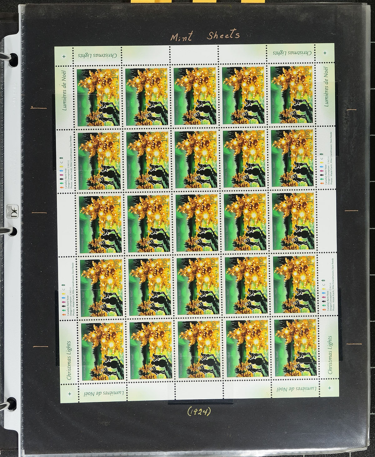 Highly specialized collection of Christmas 2001 issues, covering Unitrade #s 1922-1924, all in hingeless mounts on over 50 well described pages, housed in a binder. The collection contains mint and used singles (including booklet stamps), matched set of mint and used plate blocks, booklets, used booklet panes, and a full mint and used sheet, for every issue. The collection also includes 25 first day covers (single and block frankings), with one official cover for each issue, with the rest receiving Burnaby, B.C. postmarks from various postal outlets. Face value alone totals $146.00. A lovely collection that would be difficult to duplicate. 2024 Unitrade =