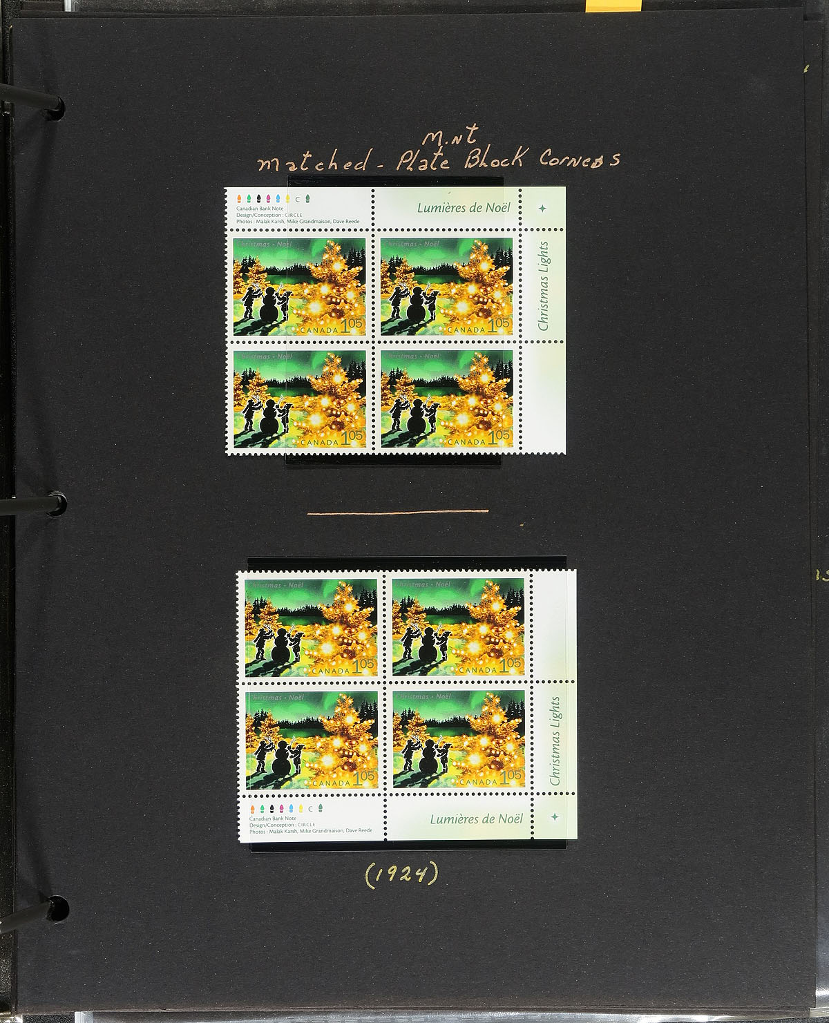 Highly specialized collection of Christmas 2001 issues, covering Unitrade #s 1922-1924, all in hingeless mounts on over 50 well described pages, housed in a binder. The collection contains mint and used singles (including booklet stamps), matched set of mint and used plate blocks, booklets, used booklet panes, and a full mint and used sheet, for every issue. The collection also includes 25 first day covers (single and block frankings), with one official cover for each issue, with the rest receiving Burnaby, B.C. postmarks from various postal outlets. Face value alone totals $146.00. A lovely collection that would be difficult to duplicate. 2024 Unitrade =