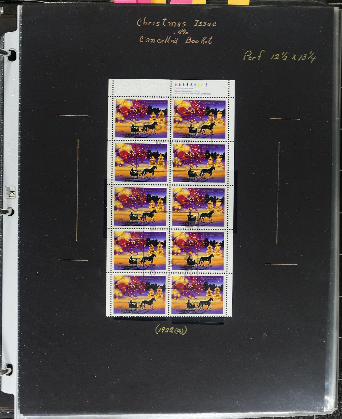 Highly specialized collection of Christmas 2001 issues, covering Unitrade #s 1922-1924, all in hingeless mounts on over 50 well described pages, housed in a binder. The collection contains mint and used singles (including booklet stamps), matched set of mint and used plate blocks, booklets, used booklet panes, and a full mint and used sheet, for every issue. The collection also includes 25 first day covers (single and block frankings), with one official cover for each issue, with the rest receiving Burnaby, B.C. postmarks from various postal outlets. Face value alone totals $146.00. A lovely collection that would be difficult to duplicate. 2024 Unitrade =