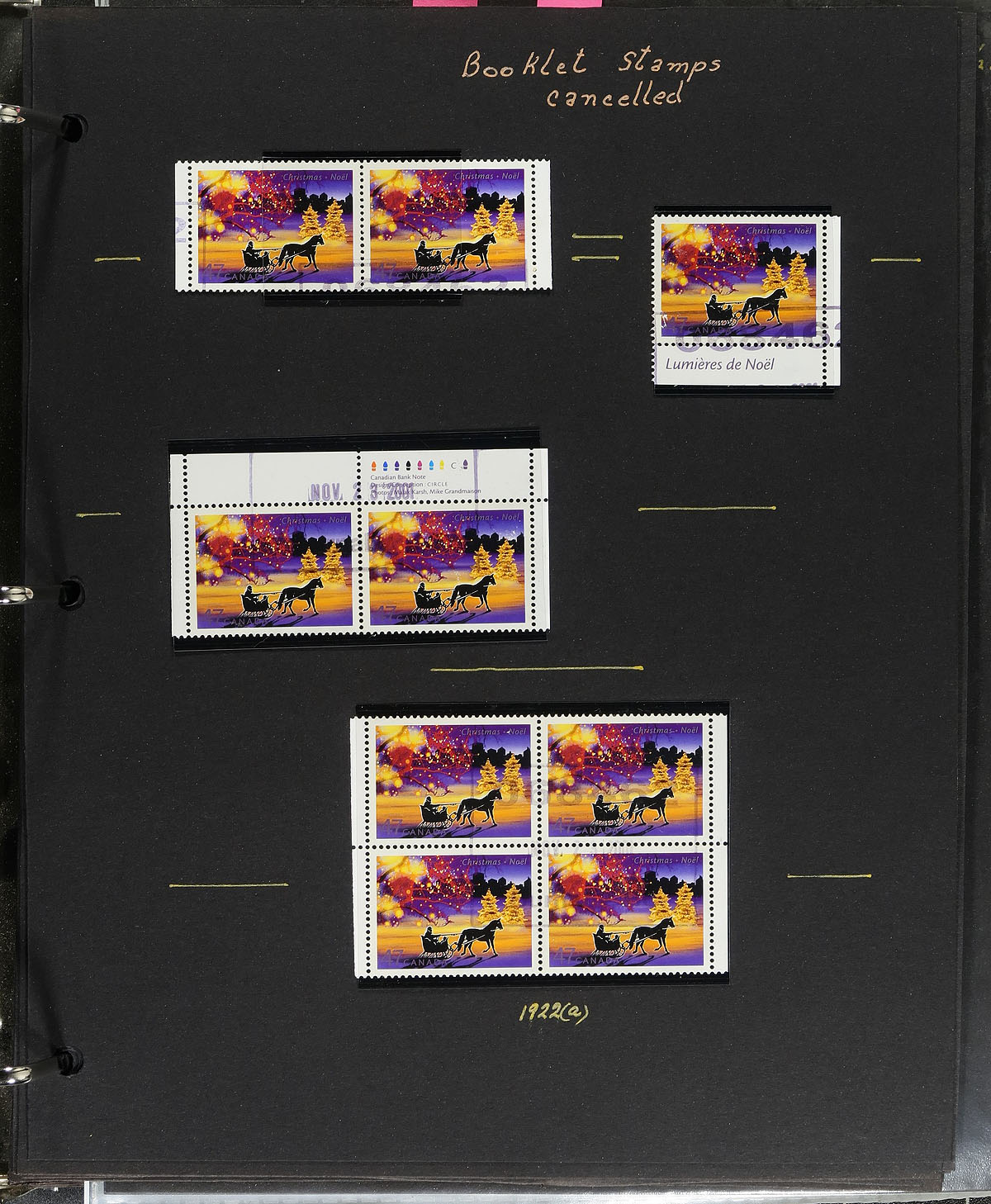 Highly specialized collection of Christmas 2001 issues, covering Unitrade #s 1922-1924, all in hingeless mounts on over 50 well described pages, housed in a binder. The collection contains mint and used singles (including booklet stamps), matched set of mint and used plate blocks, booklets, used booklet panes, and a full mint and used sheet, for every issue. The collection also includes 25 first day covers (single and block frankings), with one official cover for each issue, with the rest receiving Burnaby, B.C. postmarks from various postal outlets. Face value alone totals $146.00. A lovely collection that would be difficult to duplicate. 2024 Unitrade =
