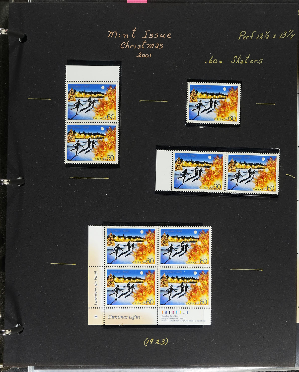 Highly specialized collection of Christmas 2001 issues, covering Unitrade #s 1922-1924, all in hingeless mounts on over 50 well described pages, housed in a binder. The collection contains mint and used singles (including booklet stamps), matched set of mint and used plate blocks, booklets, used booklet panes, and a full mint and used sheet, for every issue. The collection also includes 25 first day covers (single and block frankings), with one official cover for each issue, with the rest receiving Burnaby, B.C. postmarks from various postal outlets. Face value alone totals $146.00. A lovely collection that would be difficult to duplicate. 2024 Unitrade =