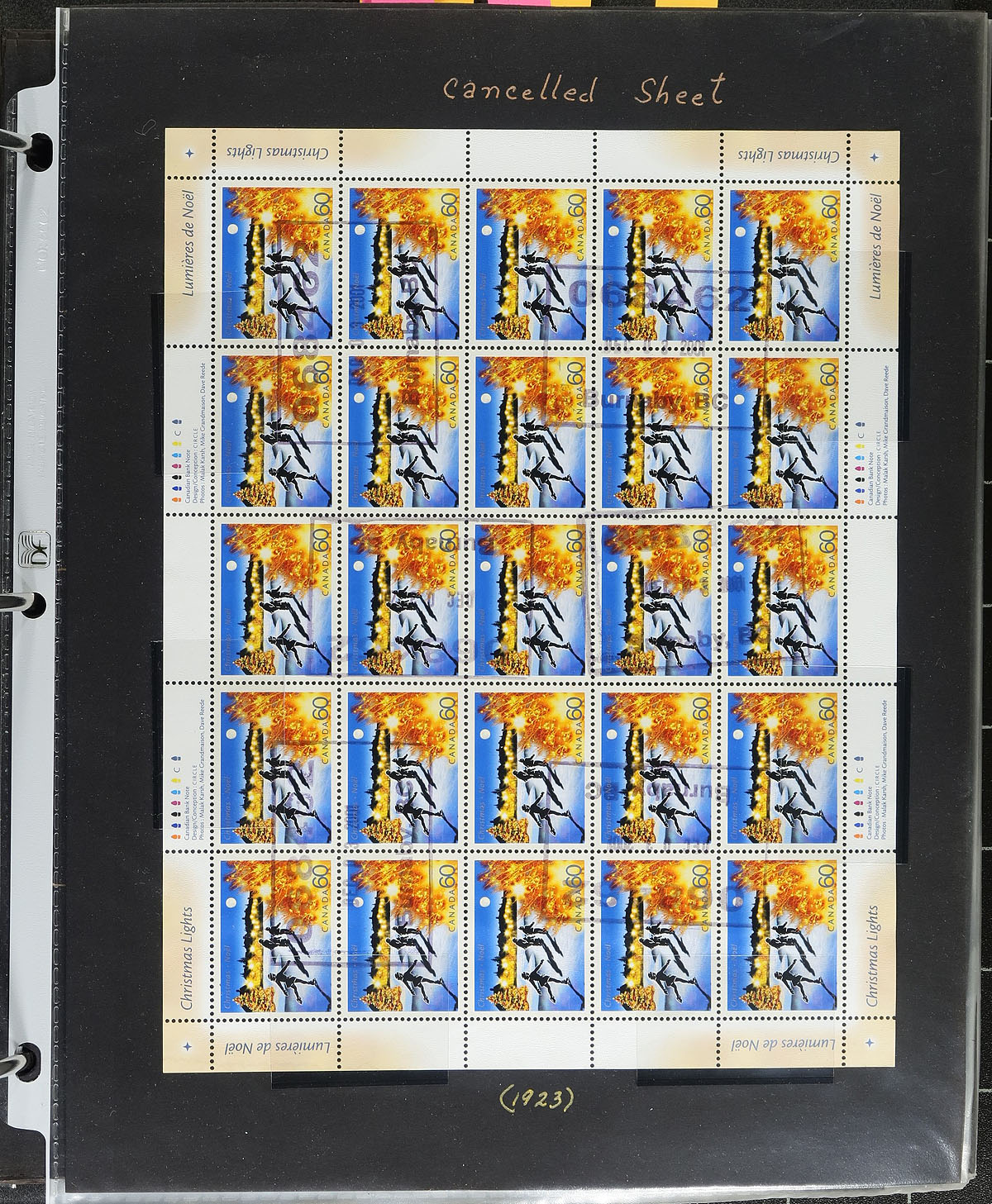 Highly specialized collection of Christmas 2001 issues, covering Unitrade #s 1922-1924, all in hingeless mounts on over 50 well described pages, housed in a binder. The collection contains mint and used singles (including booklet stamps), matched set of mint and used plate blocks, booklets, used booklet panes, and a full mint and used sheet, for every issue. The collection also includes 25 first day covers (single and block frankings), with one official cover for each issue, with the rest receiving Burnaby, B.C. postmarks from various postal outlets. Face value alone totals $146.00. A lovely collection that would be difficult to duplicate. 2024 Unitrade =