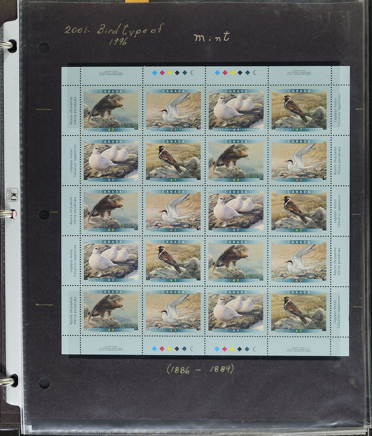 In-depth collection of primarily mint never hinged Canada, from January to June of 2001, covering Unitrade #s 1883-1906, all in hingeless mounts in over 50 well described pages, housed in a thick binder. The collection contains mint and used singles (including booklet stamps), multiples, matched set of plate blocks (including used sets), for most issues, along with a definitive issues, few souvenir sheets and sheetlets (mint and used), booklets (including used booklet panes), and first day covers. We note several match sets cataloguing $10.00 and up. Face value alone totals $229.00 A nice comprehensive collection that would be difficult to duplicate. 2024 Unitrade =