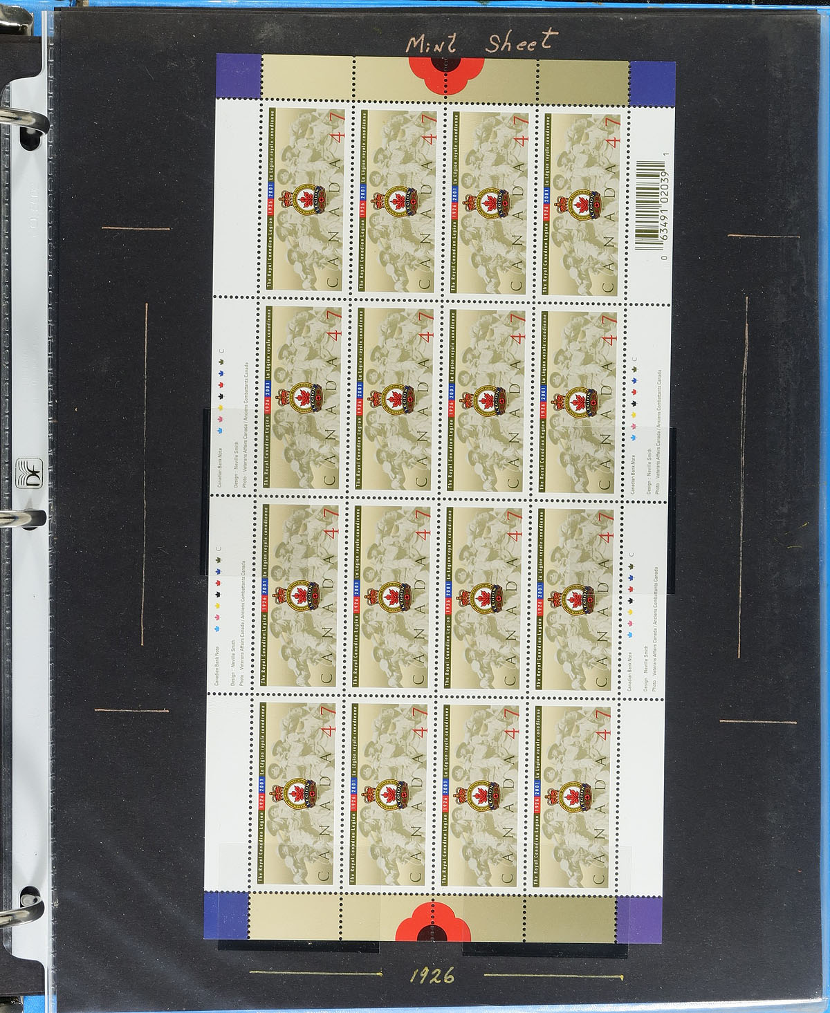 In-depth collection of primarily mint never hinged Canada, from June to December of 2001, covering Unitrade #s 1907-1926, all in hingeless mounts in over 50 well described pages, housed in a thick binder. The collection contains mint and used singles (including booklet stamps), multiples, matched set of plate blocks (including used sets), for most issues, along with a definitive issues, few souvenir sheets and sheetlets (mint and used), booklets (including used booklet panes), and first day covers. We note several match sets cataloguing $10.00 and up. Face value alone totals $211.00. A nice comprehensive collection that would be difficult to duplicate. 2024 Unitrade =
