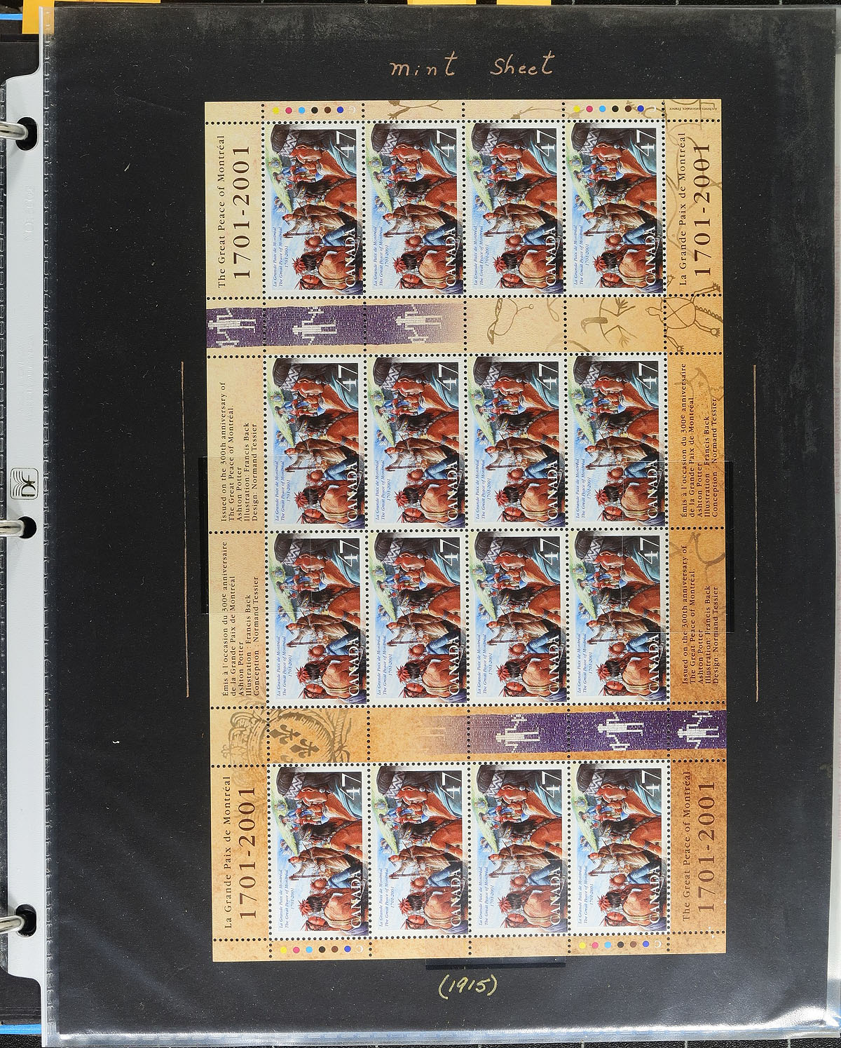 In-depth collection of primarily mint never hinged Canada, from June to December of 2001, covering Unitrade #s 1907-1926, all in hingeless mounts in over 50 well described pages, housed in a thick binder. The collection contains mint and used singles (including booklet stamps), multiples, matched set of plate blocks (including used sets), for most issues, along with a definitive issues, few souvenir sheets and sheetlets (mint and used), booklets (including used booklet panes), and first day covers. We note several match sets cataloguing $10.00 and up. Face value alone totals $211.00. A nice comprehensive collection that would be difficult to duplicate. 2024 Unitrade =