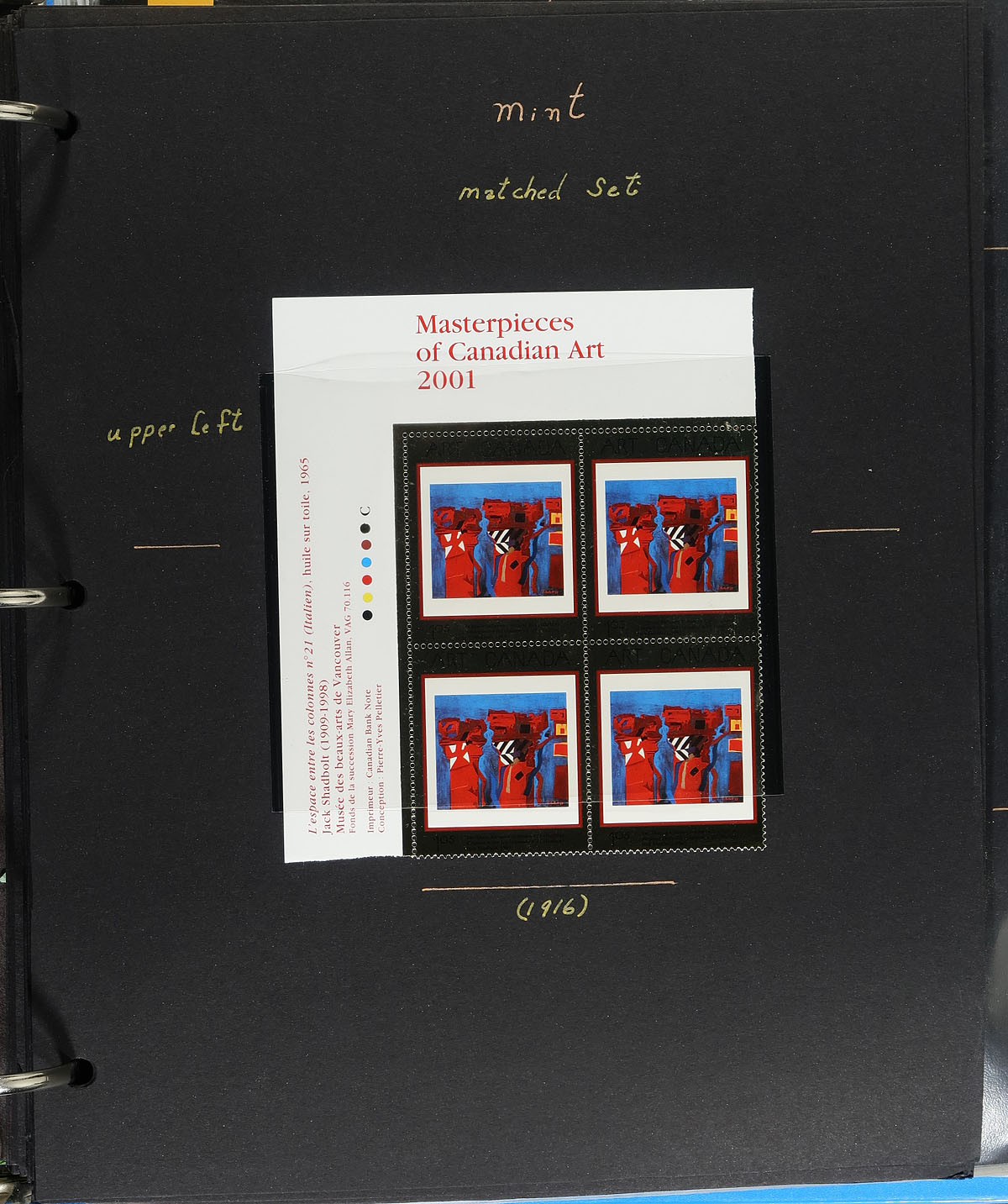 In-depth collection of primarily mint never hinged Canada, from June to December of 2001, covering Unitrade #s 1907-1926, all in hingeless mounts in over 50 well described pages, housed in a thick binder. The collection contains mint and used singles (including booklet stamps), multiples, matched set of plate blocks (including used sets), for most issues, along with a definitive issues, few souvenir sheets and sheetlets (mint and used), booklets (including used booklet panes), and first day covers. We note several match sets cataloguing $10.00 and up. Face value alone totals $211.00. A nice comprehensive collection that would be difficult to duplicate. 2024 Unitrade =