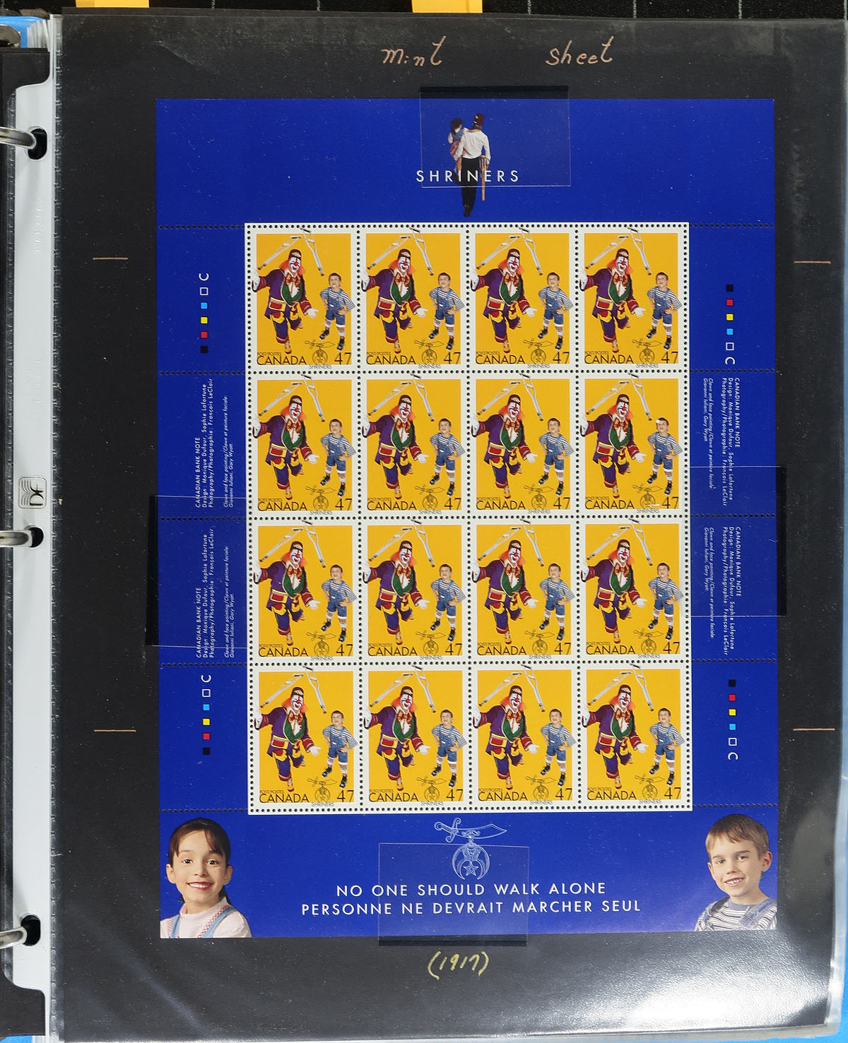 In-depth collection of primarily mint never hinged Canada, from June to December of 2001, covering Unitrade #s 1907-1926, all in hingeless mounts in over 50 well described pages, housed in a thick binder. The collection contains mint and used singles (including booklet stamps), multiples, matched set of plate blocks (including used sets), for most issues, along with a definitive issues, few souvenir sheets and sheetlets (mint and used), booklets (including used booklet panes), and first day covers. We note several match sets cataloguing $10.00 and up. Face value alone totals $211.00. A nice comprehensive collection that would be difficult to duplicate. 2024 Unitrade =