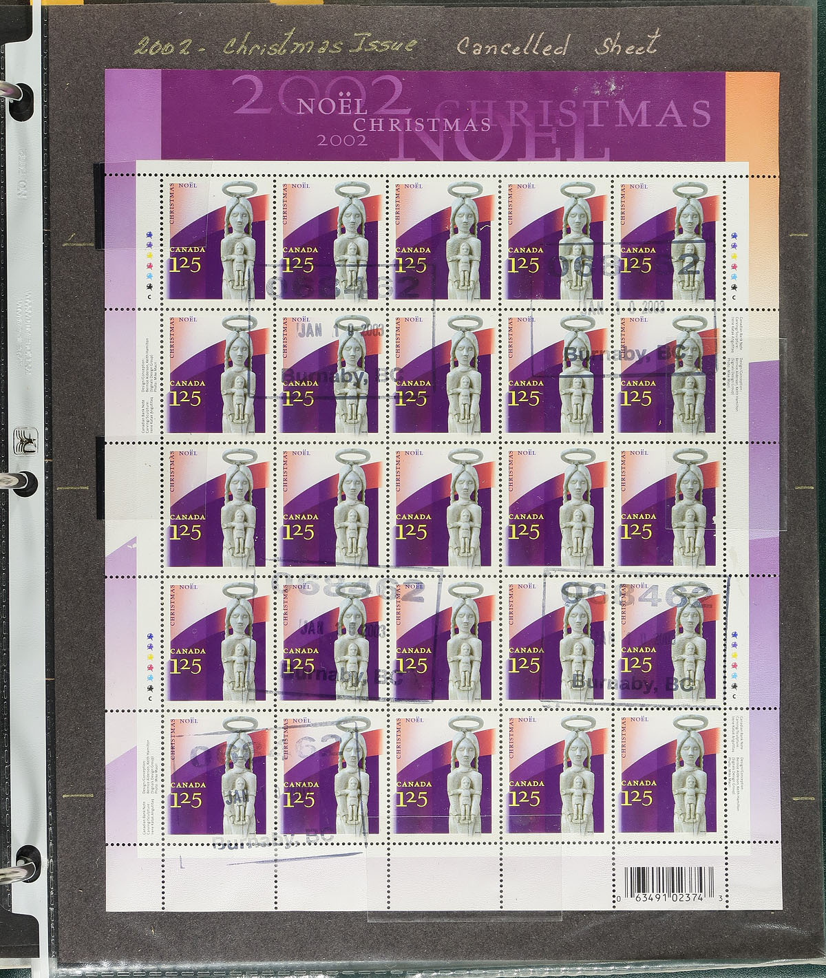 Highly specialized collection of Christmas 2002 issues, covering Unitrade #s 1965-1967, all in hingeless mounts on over 50 well described pages, housed in a binder. The collection contains mint and used singles (including booklet stamps), matched set of mint and used plate blocks, booklets, used booklet panes, and a full mint and used sheet, for every issue. The collection also includes 18 first day covers (single and block frankings), with one official cover for the set, with the rest receiving Burnaby, B.C. postmarks from various postal outlets. Face value alone totals $163.00. A lovely collection that would be difficult to duplicate. 2024 Unitrade =