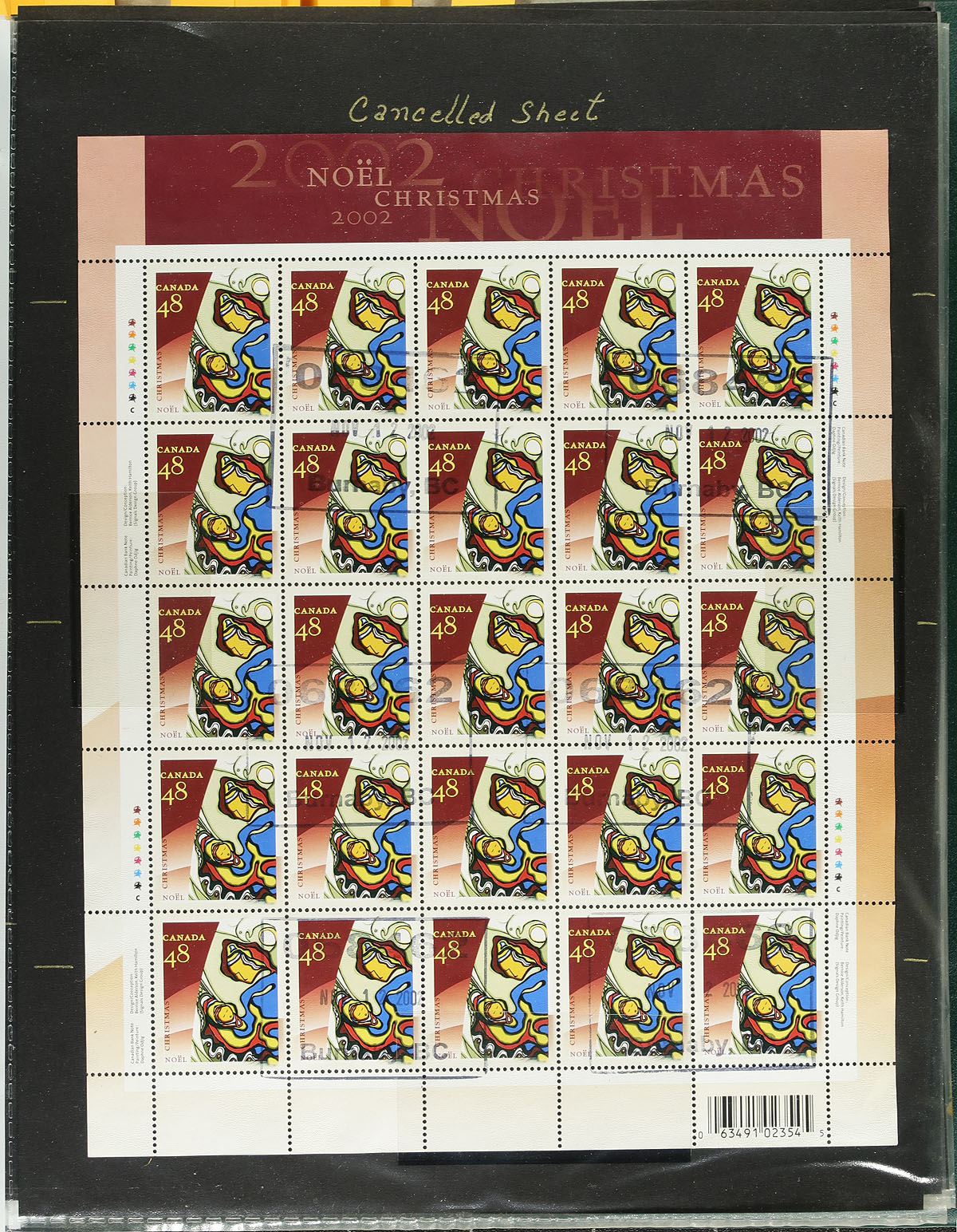 Highly specialized collection of Christmas 2002 issues, covering Unitrade #s 1965-1967, all in hingeless mounts on over 50 well described pages, housed in a binder. The collection contains mint and used singles (including booklet stamps), matched set of mint and used plate blocks, booklets, used booklet panes, and a full mint and used sheet, for every issue. The collection also includes 18 first day covers (single and block frankings), with one official cover for the set, with the rest receiving Burnaby, B.C. postmarks from various postal outlets. Face value alone totals $163.00. A lovely collection that would be difficult to duplicate. 2024 Unitrade =