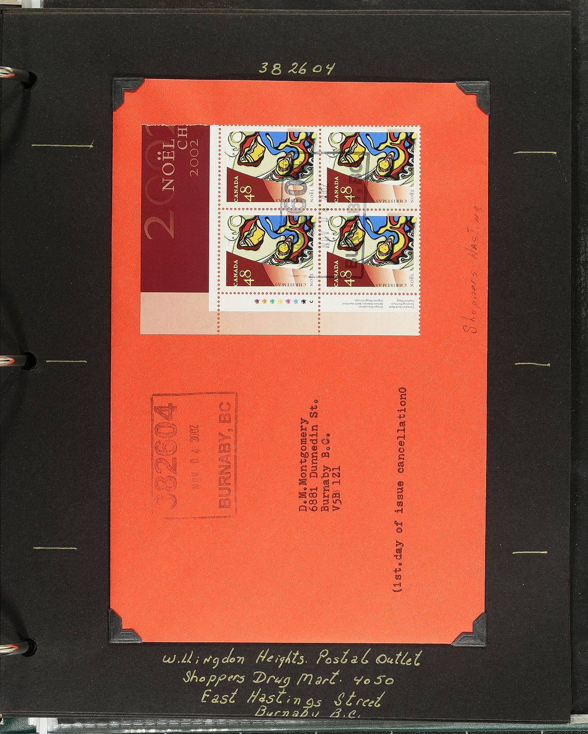 Highly specialized collection of Christmas 2002 issues, covering Unitrade #s 1965-1967, all in hingeless mounts on over 50 well described pages, housed in a binder. The collection contains mint and used singles (including booklet stamps), matched set of mint and used plate blocks, booklets, used booklet panes, and a full mint and used sheet, for every issue. The collection also includes 18 first day covers (single and block frankings), with one official cover for the set, with the rest receiving Burnaby, B.C. postmarks from various postal outlets. Face value alone totals $163.00. A lovely collection that would be difficult to duplicate. 2024 Unitrade =