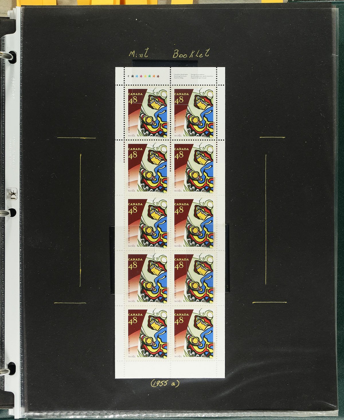Highly specialized collection of Christmas 2002 issues, covering Unitrade #s 1965-1967, all in hingeless mounts on over 50 well described pages, housed in a binder. The collection contains mint and used singles (including booklet stamps), matched set of mint and used plate blocks, booklets, used booklet panes, and a full mint and used sheet, for every issue. The collection also includes 18 first day covers (single and block frankings), with one official cover for the set, with the rest receiving Burnaby, B.C. postmarks from various postal outlets. Face value alone totals $163.00. A lovely collection that would be difficult to duplicate. 2024 Unitrade =