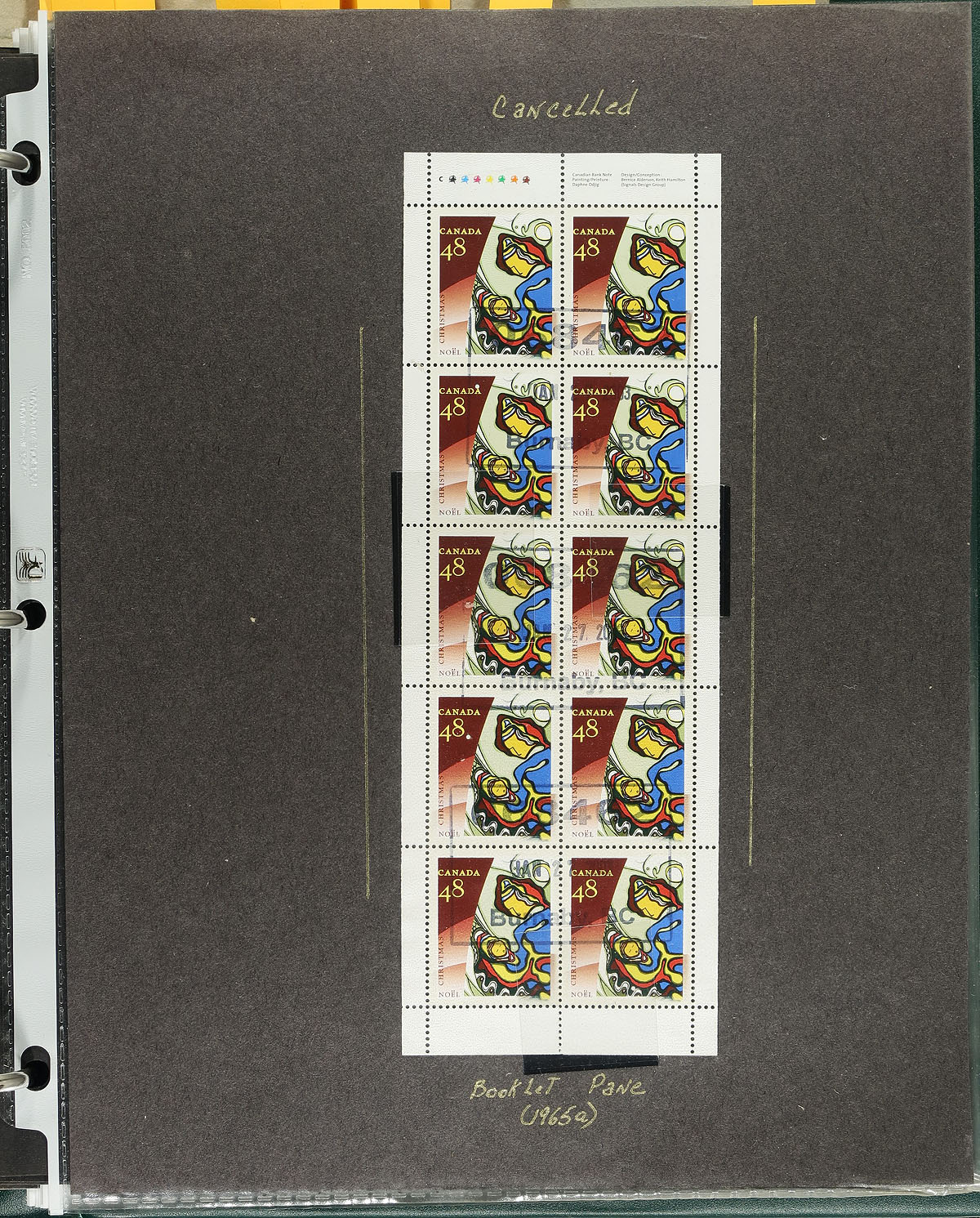 Highly specialized collection of Christmas 2002 issues, covering Unitrade #s 1965-1967, all in hingeless mounts on over 50 well described pages, housed in a binder. The collection contains mint and used singles (including booklet stamps), matched set of mint and used plate blocks, booklets, used booklet panes, and a full mint and used sheet, for every issue. The collection also includes 18 first day covers (single and block frankings), with one official cover for the set, with the rest receiving Burnaby, B.C. postmarks from various postal outlets. Face value alone totals $163.00. A lovely collection that would be difficult to duplicate. 2024 Unitrade =