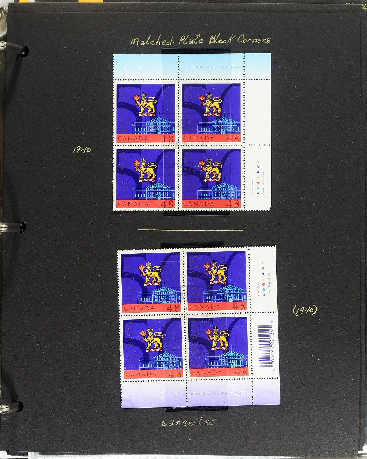 In-depth collection of primarily mint never hinged Canada, from January to May of 2002, covering Unitrade #s 1936-1951, all in hingeless mounts in over 50 well described pages, housed in a thick binder. The collection contains mint and used singles (including booklet stamps), multiples, matched set of plate blocks (including used sets), for most issues, along with a definitive issues, few souvenir sheets and sheetlets (mint and used), booklets (including used booklet panes), and first day covers. We note several match sets cataloguing $10.00 and up. Face value alone totals $180.00. A nice comprehensive collection that would be difficult to duplicate. 2024 Unitrade =