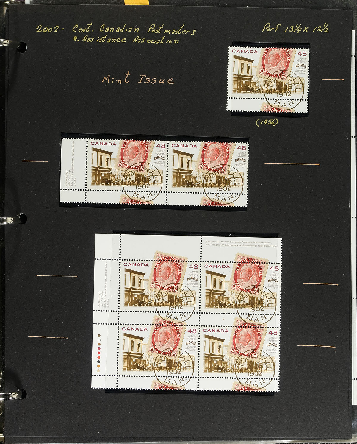 In-depth collection of primarily mint never hinged Canada, from January to June of 2001, covering Unitrade #s 1952-1964, 1968, all in hingeless mounts in over 50 well described pages, housed in a thick binder. The collection contains mint and used singles (including booklet stamps), multiples, matched set of plate blocks (including used sets), for most issues, along with a definitive issues, few souvenir sheets and sheetlets (mint and used), booklets (including used booklet panes), and first day covers. We note several match sets cataloguing $10.00 and up. Face value alone totals $197.00. A nice comprehensive collection that would be difficult to duplicate. 2024 Unitrade =