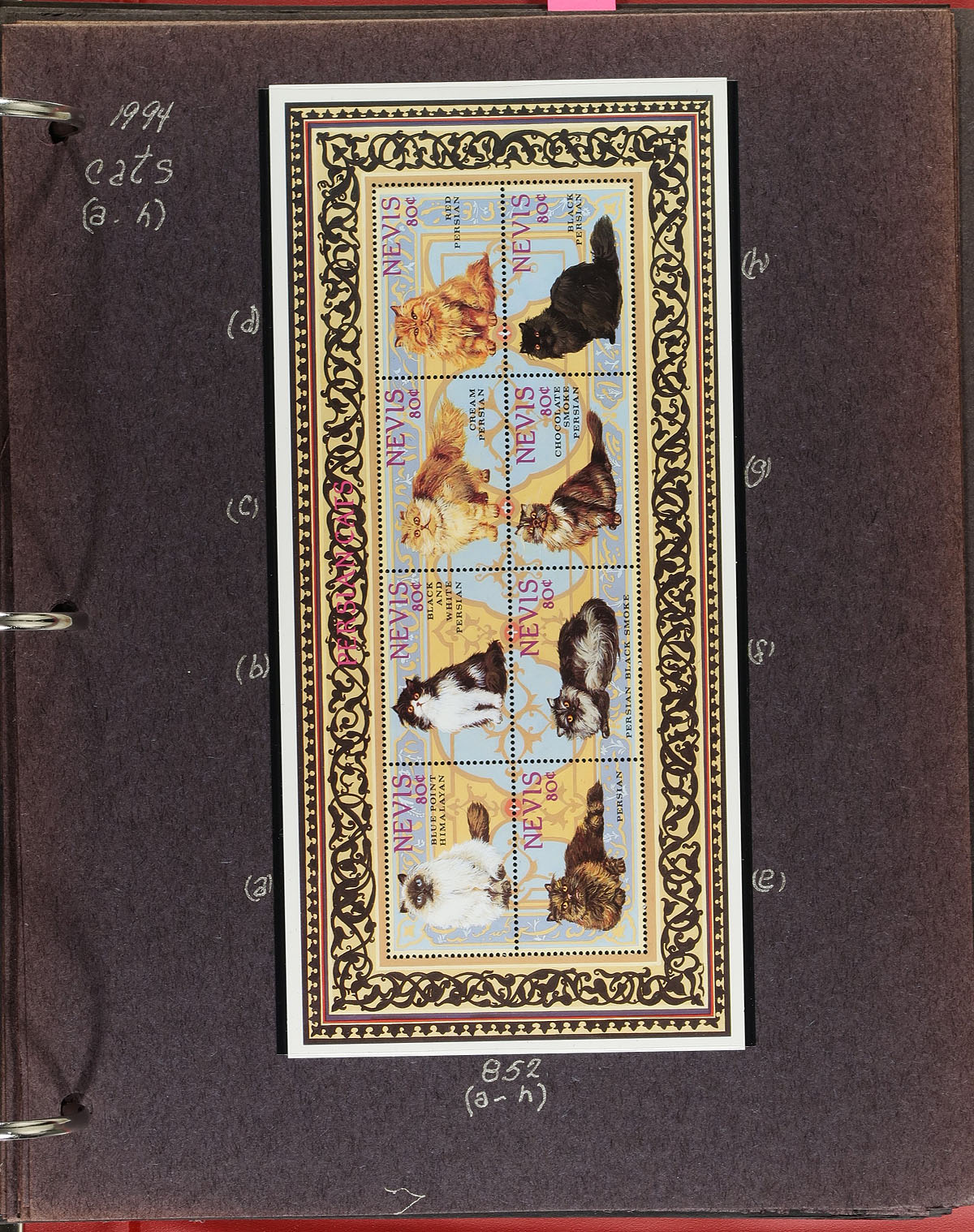 Collection Part A. Lovely mint never hinged collection of Nevis, 1980-2005, containing a few thousand stamps all in hingeless mounts, on a few hundred well described pages housed in 7 binders. This well-organized collection ranges from Scott #100/1468, including over 200 souvenir sheets and or sheetlets, along with Offcials O1-O66, noting a few sets and souvenir sheets cataloguing in the $10.00 to $25.00 range each. A nice opportunity for all collectors, including many thematic subjects noting sports, transportation, famous people, animals, butterflies, space, entertainers, and so much more. Our online photos show a small sampling, overall fine to very fine. 2025 Scott $3,081.00 =