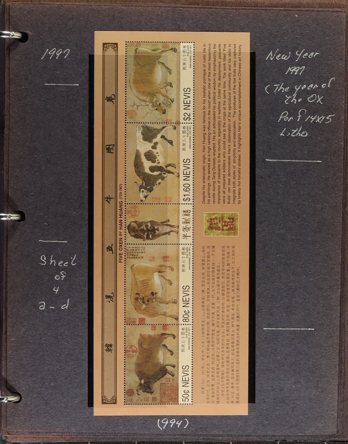 Collection Part A. Lovely mint never hinged collection of Nevis, 1980-2005, containing a few thousand stamps all in hingeless mounts, on a few hundred well described pages housed in 7 binders. This well-organized collection ranges from Scott #100/1468, including over 200 souvenir sheets and or sheetlets, along with Offcials O1-O66, noting a few sets and souvenir sheets cataloguing in the $10.00 to $25.00 range each. A nice opportunity for all collectors, including many thematic subjects noting sports, transportation, famous people, animals, butterflies, space, entertainers, and so much more. Our online photos show a small sampling, overall fine to very fine. 2025 Scott $3,081.00 =