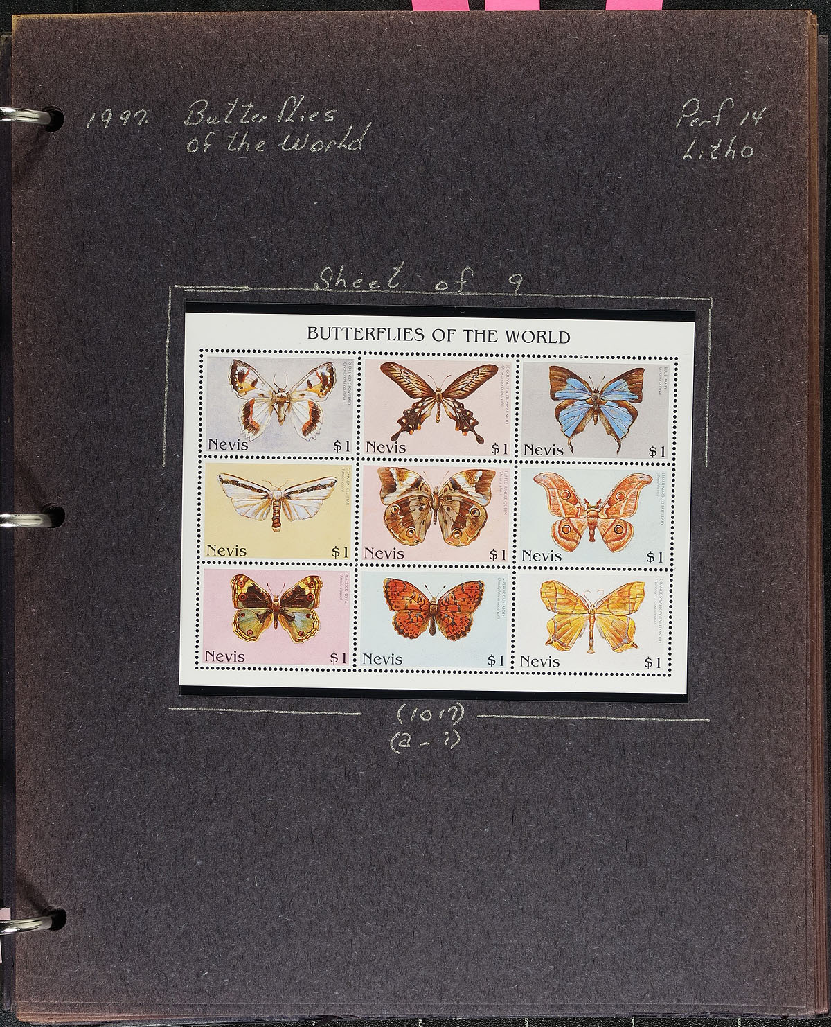 Collection Part A. Lovely mint never hinged collection of Nevis, 1980-2005, containing a few thousand stamps all in hingeless mounts, on a few hundred well described pages housed in 7 binders. This well-organized collection ranges from Scott #100/1468, including over 200 souvenir sheets and or sheetlets, along with Offcials O1-O66, noting a few sets and souvenir sheets cataloguing in the $10.00 to $25.00 range each. A nice opportunity for all collectors, including many thematic subjects noting sports, transportation, famous people, animals, butterflies, space, entertainers, and so much more. Our online photos show a small sampling, overall fine to very fine. 2025 Scott $3,081.00 =