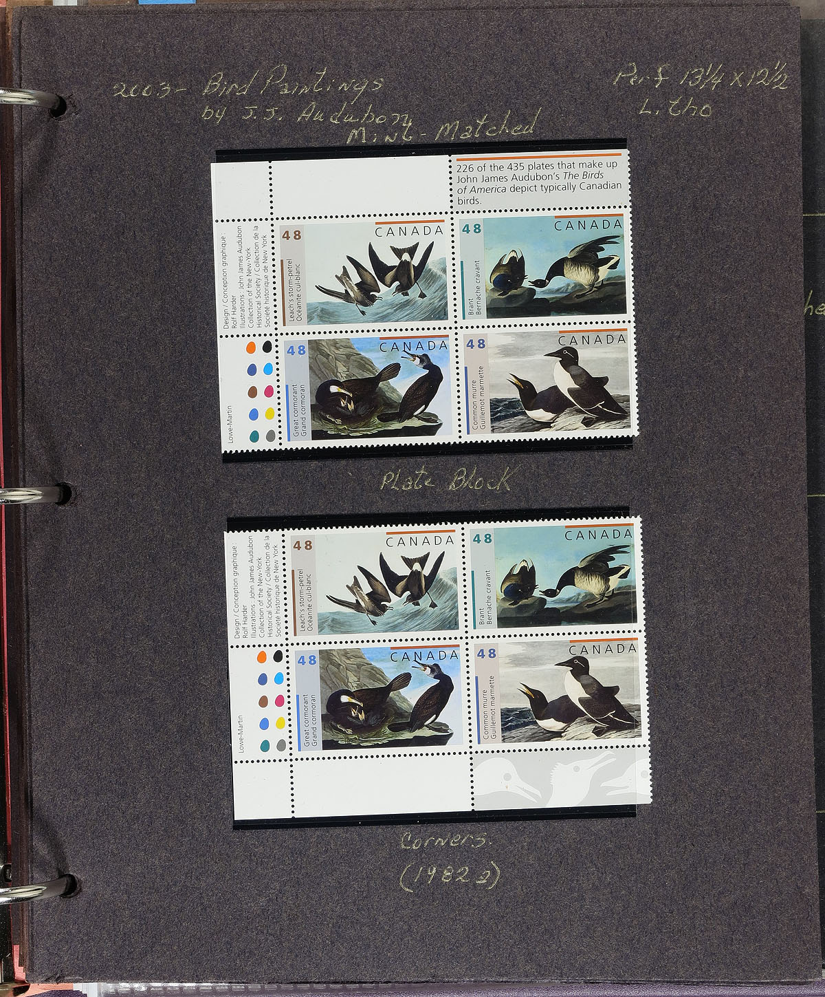 In-depth collection of primarily mint never hinged Canada, from January to June of 2003, covering Unitrade #s 1969-1987, all in hingeless mounts in over 50 well described pages, housed in a thick binder. The collection contains mint and used singles (including booklet stamps), multiples, matched set of plate blocks (including used sets), for most issues, along with a definitive issues, few souvenir sheets and sheetlets (mint and used), booklets (including used booklet panes), and first day covers. We note several match sets cataloguing $10.00 and up. Face value alone totals $188.00. A nice comprehensive collection that would be difficult to duplicate. 2024 Unitrade =