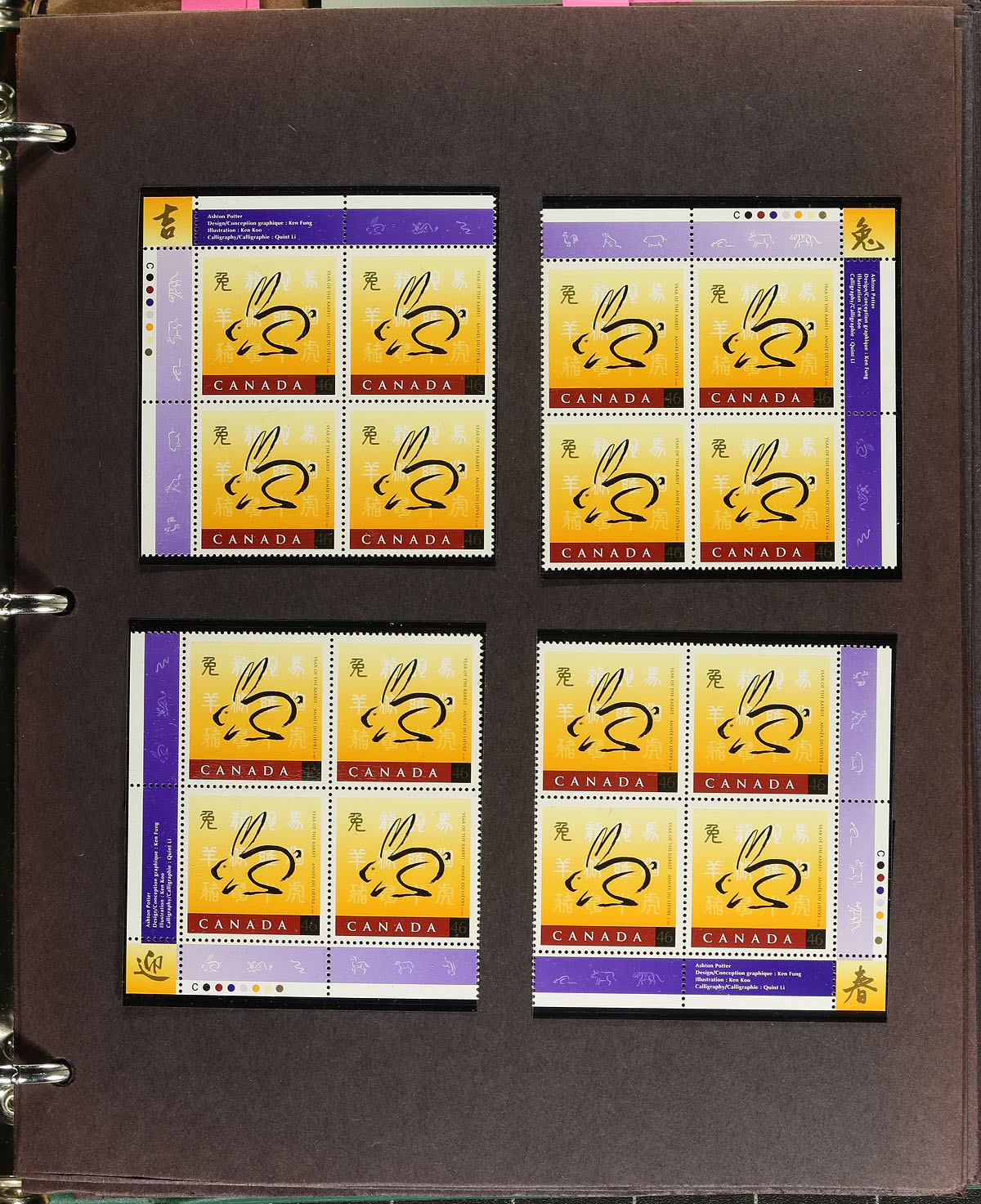 In-depth collection of primarily mint never hinged Canada, from January to June of 1999, covering Unitrade #s 1767-1799 all in hingeless mounts in over 50 well described pages, housed in a thick binder. The collection contains mint and used singles (including booklet stamps), multiples, matched set of plate blocks (including used sets), for most issues, along with a few souvenir sheets (mint and used), sheetlets, booklets (including used booklet panes), and first day covers. We note several match sets cataloguing $10.00 and up. Face value alone totals $250.00. A nice comprehensive collection that would be difficult to duplicate. 2024 Unitrade =