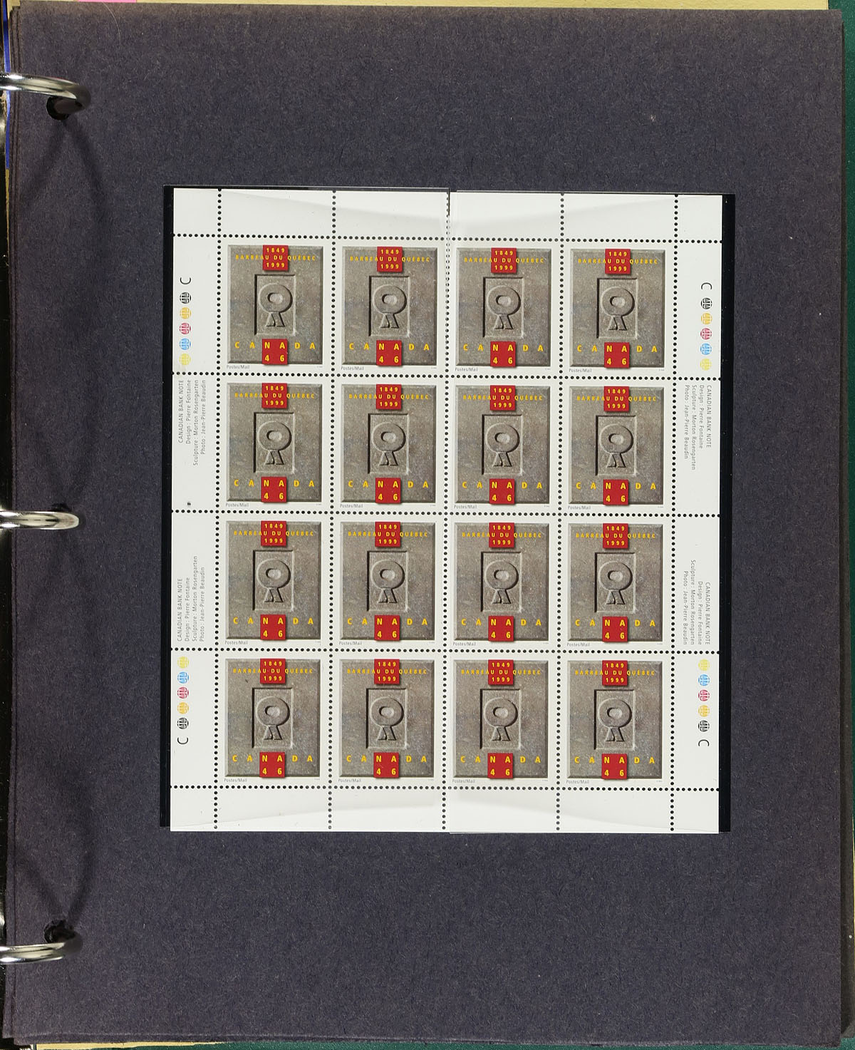 In-depth collection of primarily mint never hinged Canada, from January to June of 1999, covering Unitrade #s 1767-1799 all in hingeless mounts in over 50 well described pages, housed in a thick binder. The collection contains mint and used singles (including booklet stamps), multiples, matched set of plate blocks (including used sets), for most issues, along with a few souvenir sheets (mint and used), sheetlets, booklets (including used booklet panes), and first day covers. We note several match sets cataloguing $10.00 and up. Face value alone totals $250.00. A nice comprehensive collection that would be difficult to duplicate. 2024 Unitrade =