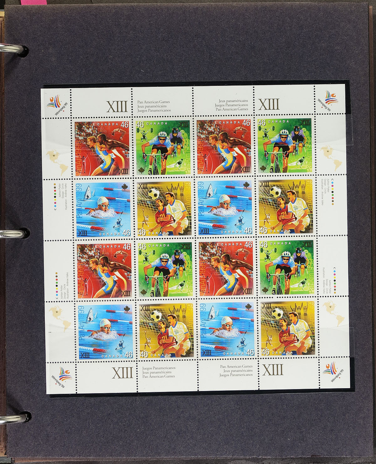 In-depth collection of primarily mint never hinged Canada, from July to December of 1999, covering Unitrade #s 1800-1817 all in hingeless mounts in over 50 well described pages, housed in a binder. The collection contains mint and used singles (including booklet stamps), multiples, matched set of plate blocks (including used sets), for most issues, along with a few souvenir sheets (mint and used), sheetlets, booklets (including used booklet panes), and first day covers. We note several match sets cataloguing $10.00 and up. Face value alone totals $255.00. A nice comprehensive collection that would be difficult to duplicate. 2024 Unitrade =