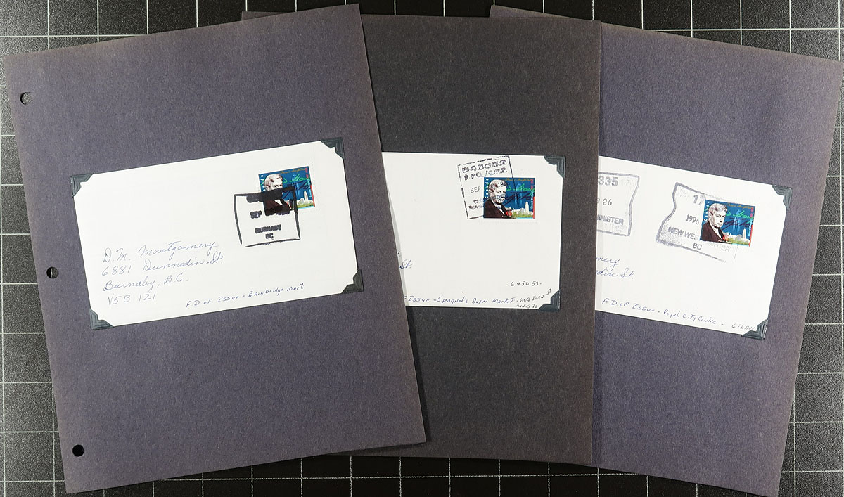 British Columbia Postmarks. Interesting collection of a few hundred Canada first day covers, all with British Columbia postmarks. The majority of covers range from 1996 to 1999, where the collector created 3-5 first day covers for most issues in period, all with what appears Lower Mainland postmarks from various postal outlets including cities New Westminster, Vancouver, Burnaby, North and West Vancouver, Langley, and Coquitlam. The majority of frankings are singles, but note a few plate blocks and souvenir sheets. A most interesting collection that would be missing from first day cover collections, and should pose some interest for modern BC postmarks collectors. Estimate =