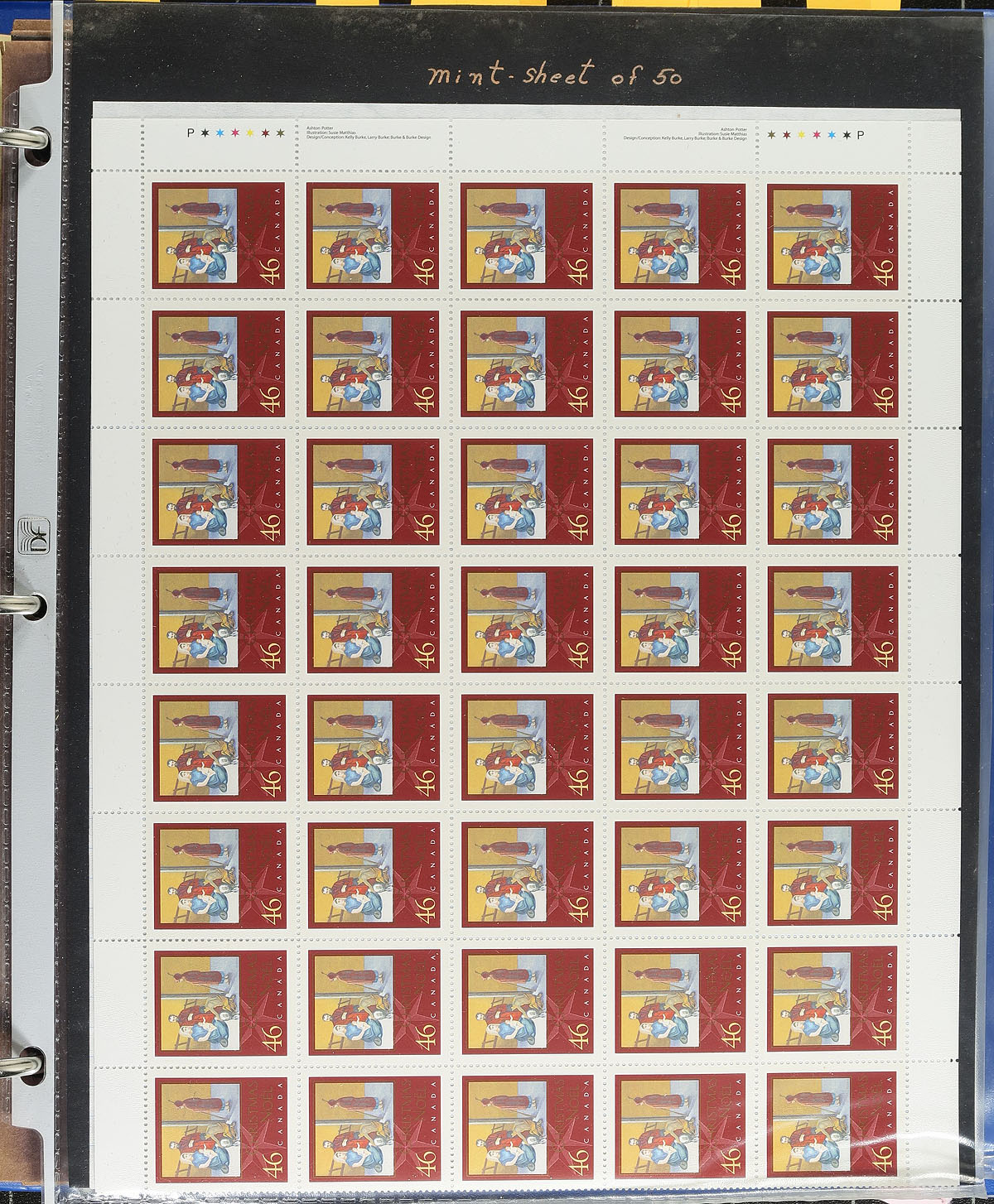 Highly specialized collection of Christmas 2000 issues, covering Unitrade #s 1873-1875, all in hingeless mounts on over 50 well described pages, housed in a binder. The collection contains mint and used singles (including booklet stamps), matched set of mint and used plate blocks, booklets, used booklet panes, and a full sheet (folded), for every issue. The collection also includes 27 first day covers (single and plate block frankings), with one official cover for each issue, with the rest receiving Burnaby, B.C. postmarks from various postal outlets. Face value alone totals $180.00. A lovely collection that would be difficult to duplicate. 2024 Unitrade =