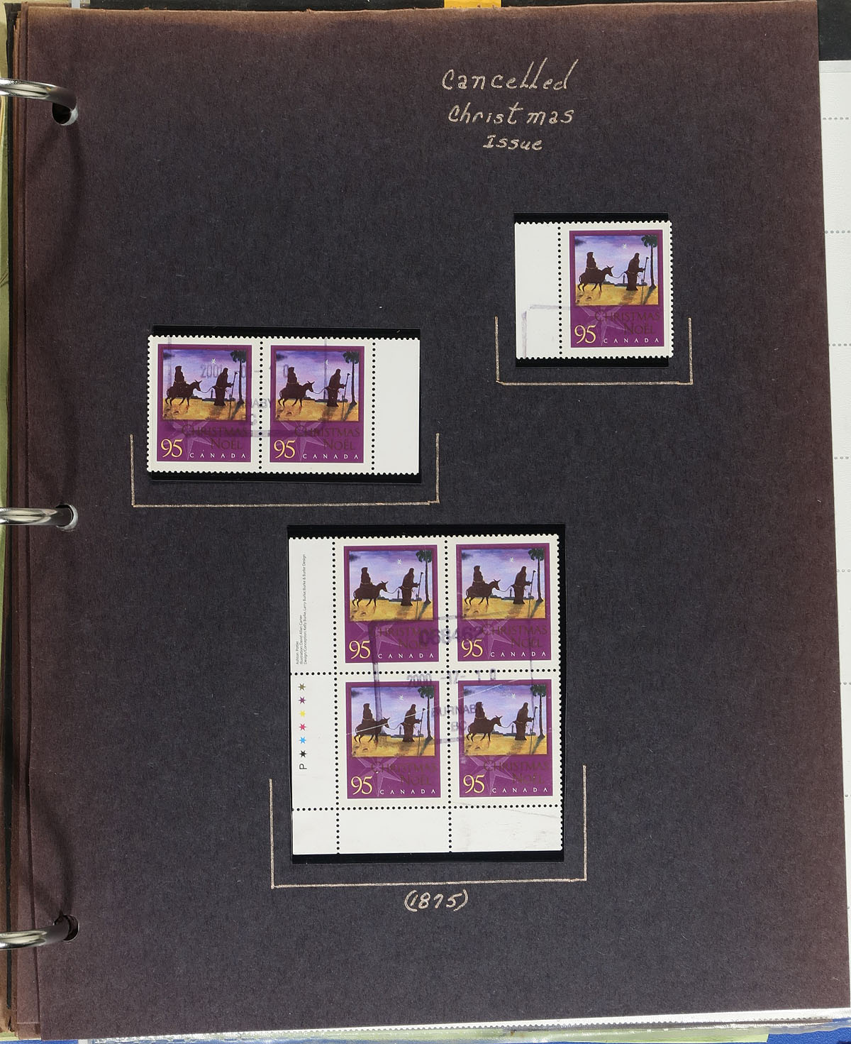 Highly specialized collection of Christmas 2000 issues, covering Unitrade #s 1873-1875, all in hingeless mounts on over 50 well described pages, housed in a binder. The collection contains mint and used singles (including booklet stamps), matched set of mint and used plate blocks, booklets, used booklet panes, and a full sheet (folded), for every issue. The collection also includes 27 first day covers (single and plate block frankings), with one official cover for each issue, with the rest receiving Burnaby, B.C. postmarks from various postal outlets. Face value alone totals $180.00. A lovely collection that would be difficult to duplicate. 2024 Unitrade =