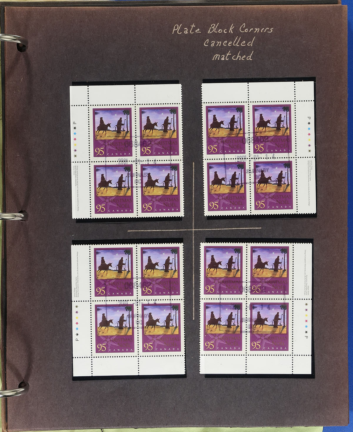Highly specialized collection of Christmas 2000 issues, covering Unitrade #s 1873-1875, all in hingeless mounts on over 50 well described pages, housed in a binder. The collection contains mint and used singles (including booklet stamps), matched set of mint and used plate blocks, booklets, used booklet panes, and a full sheet (folded), for every issue. The collection also includes 27 first day covers (single and plate block frankings), with one official cover for each issue, with the rest receiving Burnaby, B.C. postmarks from various postal outlets. Face value alone totals $180.00. A lovely collection that would be difficult to duplicate. 2024 Unitrade =
