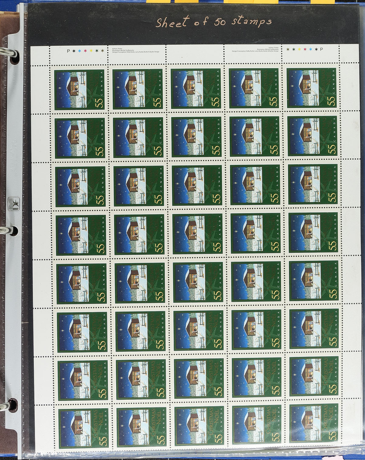Highly specialized collection of Christmas 2000 issues, covering Unitrade #s 1873-1875, all in hingeless mounts on over 50 well described pages, housed in a binder. The collection contains mint and used singles (including booklet stamps), matched set of mint and used plate blocks, booklets, used booklet panes, and a full sheet (folded), for every issue. The collection also includes 27 first day covers (single and plate block frankings), with one official cover for each issue, with the rest receiving Burnaby, B.C. postmarks from various postal outlets. Face value alone totals $180.00. A lovely collection that would be difficult to duplicate. 2024 Unitrade =