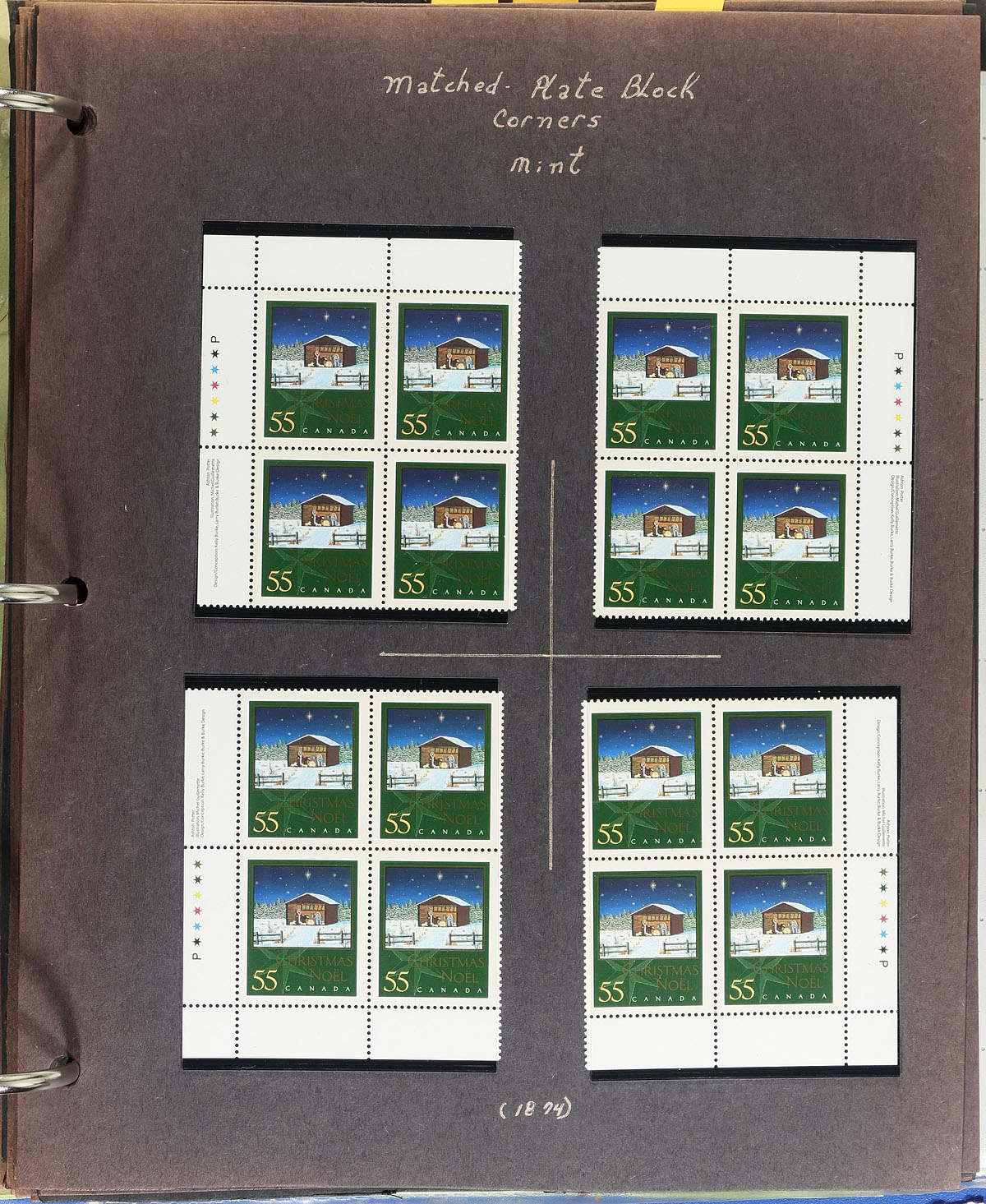Highly specialized collection of Christmas 2000 issues, covering Unitrade #s 1873-1875, all in hingeless mounts on over 50 well described pages, housed in a binder. The collection contains mint and used singles (including booklet stamps), matched set of mint and used plate blocks, booklets, used booklet panes, and a full sheet (folded), for every issue. The collection also includes 27 first day covers (single and plate block frankings), with one official cover for each issue, with the rest receiving Burnaby, B.C. postmarks from various postal outlets. Face value alone totals $180.00. A lovely collection that would be difficult to duplicate. 2024 Unitrade =