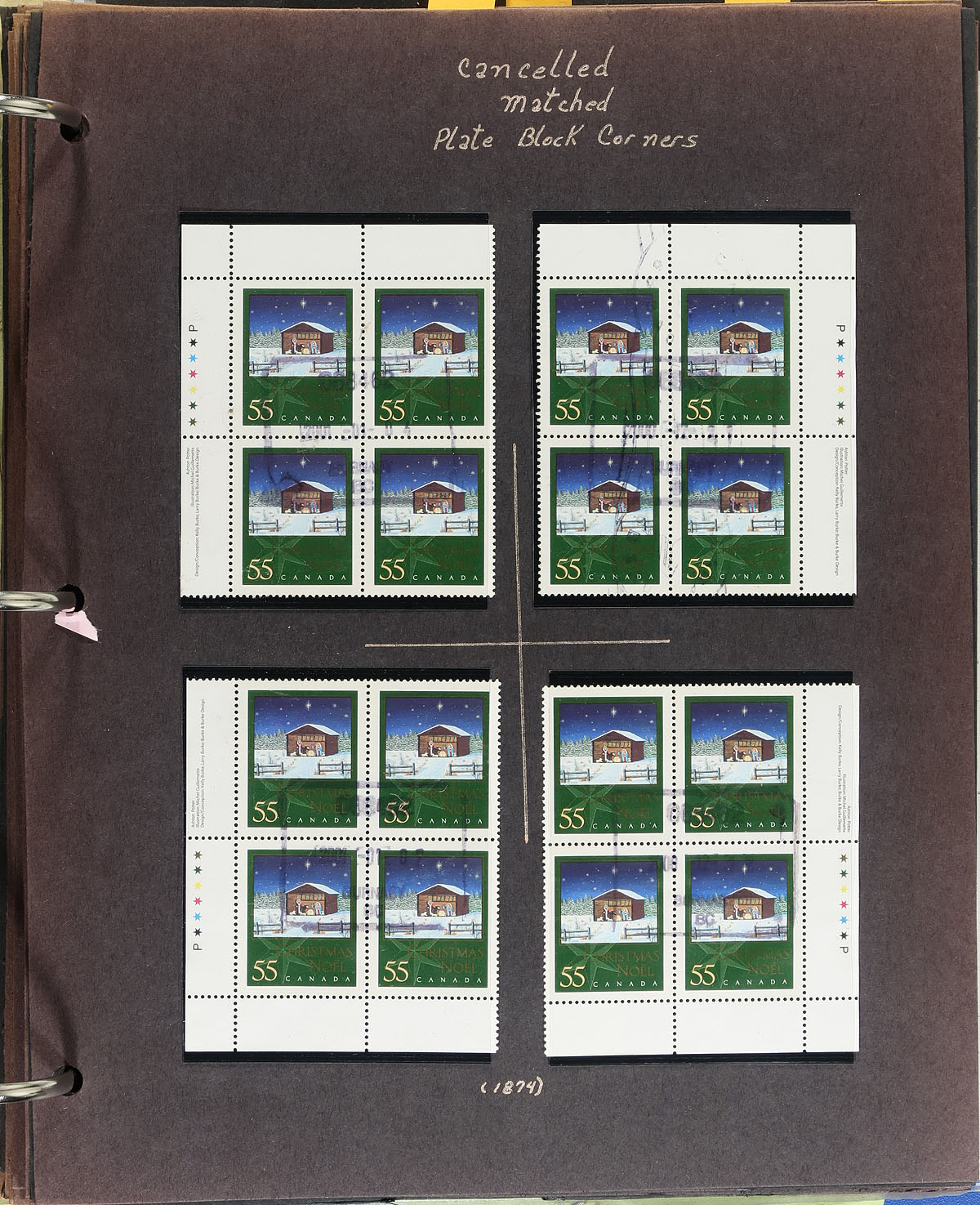 Highly specialized collection of Christmas 2000 issues, covering Unitrade #s 1873-1875, all in hingeless mounts on over 50 well described pages, housed in a binder. The collection contains mint and used singles (including booklet stamps), matched set of mint and used plate blocks, booklets, used booklet panes, and a full sheet (folded), for every issue. The collection also includes 27 first day covers (single and plate block frankings), with one official cover for each issue, with the rest receiving Burnaby, B.C. postmarks from various postal outlets. Face value alone totals $180.00. A lovely collection that would be difficult to duplicate. 2024 Unitrade =