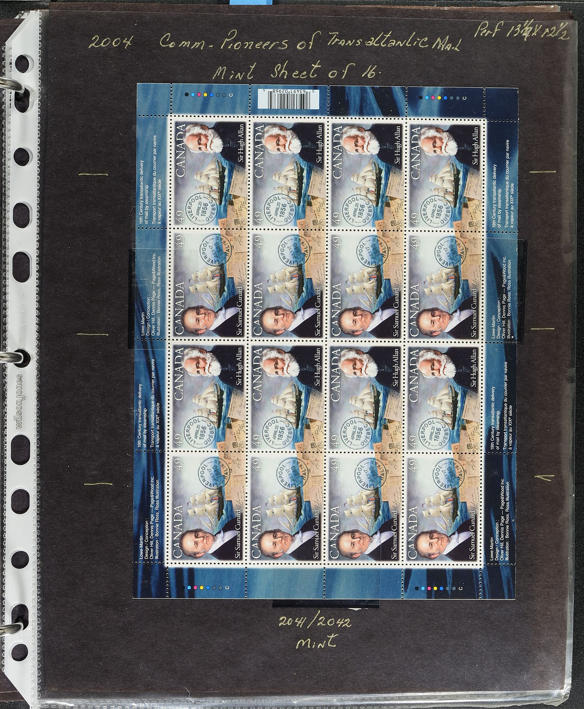 In-depth collection of primarily mint never hinged Canada, from January to June of 2004, covering Unitrade #s 2023-2044, all in hingeless mounts in over 50 well described pages, housed in a thick binder. The collection contains mint and used singles (including booklet stamps), multiples, matched set of plate blocks (including used sets), for some issues, along with a few souvenir sheets and sheetlets (mint and used), booklets (including used booklet panes), and first day covers. We note several match sets cataloguing $10.00 and up. Face value alone totals $190.00. A nice comprehensive collection that would be difficult to duplicate. 2024 Unitrade =