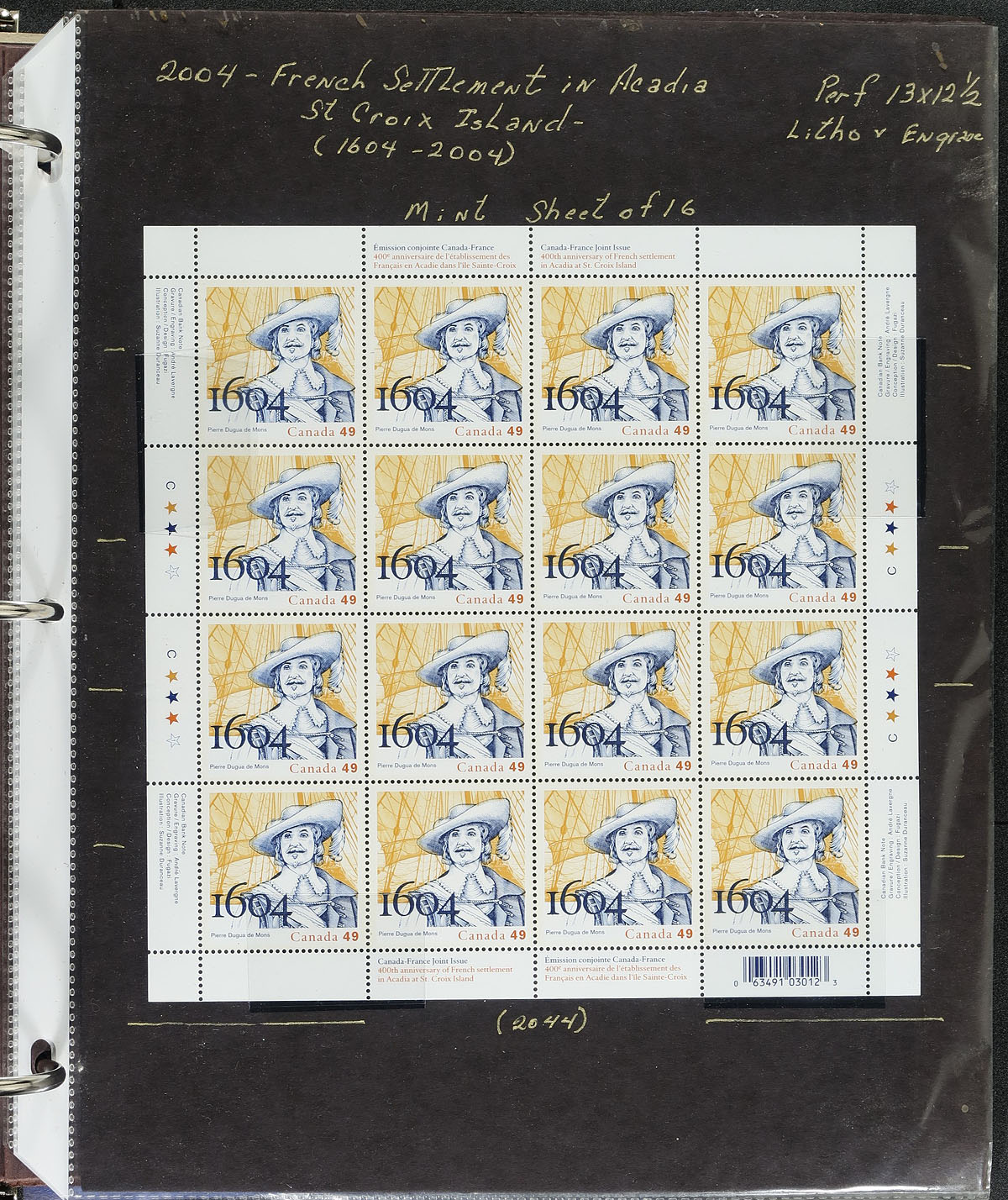 In-depth collection of primarily mint never hinged Canada, from January to June of 2004, covering Unitrade #s 2023-2044, all in hingeless mounts in over 50 well described pages, housed in a thick binder. The collection contains mint and used singles (including booklet stamps), multiples, matched set of plate blocks (including used sets), for some issues, along with a few souvenir sheets and sheetlets (mint and used), booklets (including used booklet panes), and first day covers. We note several match sets cataloguing $10.00 and up. Face value alone totals $190.00. A nice comprehensive collection that would be difficult to duplicate. 2024 Unitrade =