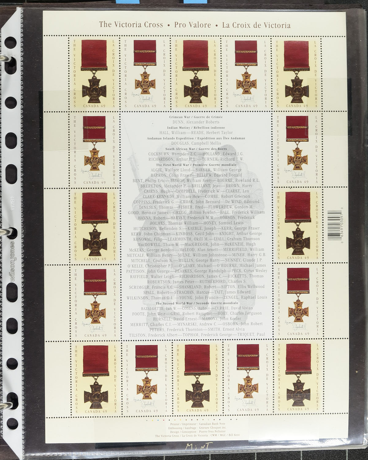 In-depth collection of primarily mint never hinged Canada, from July to December of 2004, covering Unitrade #s 2049-2052, 2056-2062, 2065-2082, all in hingeless mounts in over 50 well described pages, housed in a thick binder. The collection contains mint and used singles (including booklet stamps), multiples, matched set of plate blocks (including used sets), for some issues, along with definitive issues, a few souvenir sheets and sheetlets (mint and used), booklets (including used booklet panes), and first day covers. We note several match sets cataloguing $10.00 and up. Face value alone totals $174.00. A nice comprehensive collection that would be difficult to duplicate. 2024 Unitrade =