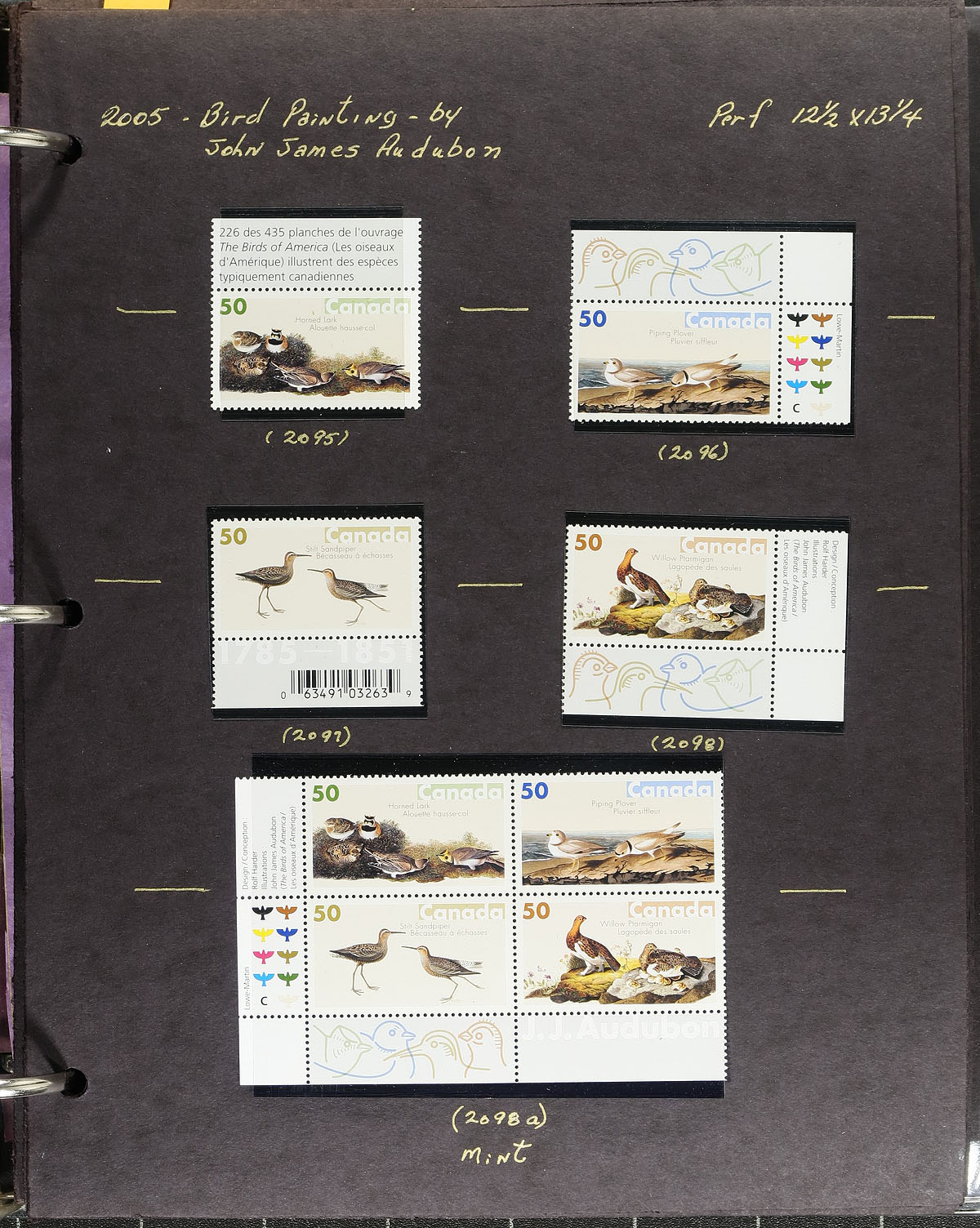 In-depth collection of primarily mint never hinged Canada, from January to May of 2005, covering Unitrade #s 2083-2108, all in hingeless mounts in over 50 well described pages, housed in a thick binder. The collection contains mint and used singles (including booklet stamps), multiples, matched set of plate blocks (including used sets), for some issues, along with a few souvenir sheets and sheetlets (mint and used), booklets (including used booklet panes), and first day covers. We note several match sets cataloguing $10.00 and up. Face value alone totals $209.00. A nice comprehensive collection that would be difficult to duplicate. 2024 Unitrade =