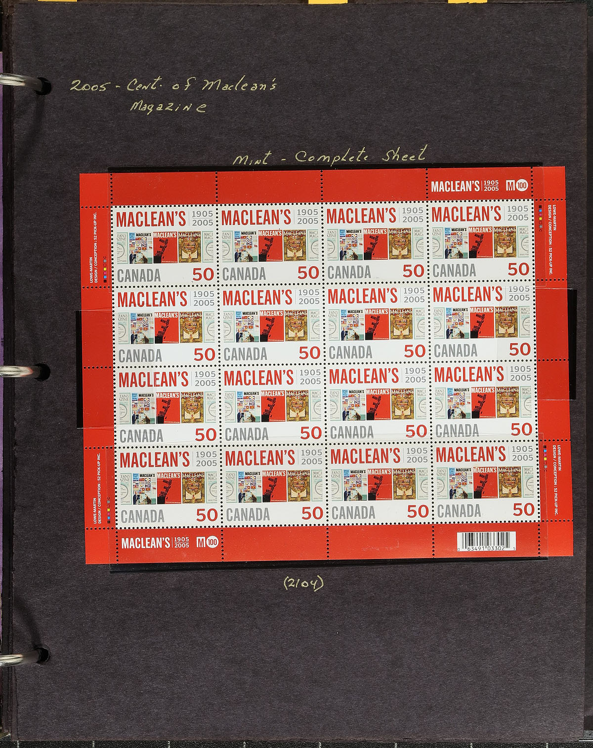 In-depth collection of primarily mint never hinged Canada, from January to May of 2005, covering Unitrade #s 2083-2108, all in hingeless mounts in over 50 well described pages, housed in a thick binder. The collection contains mint and used singles (including booklet stamps), multiples, matched set of plate blocks (including used sets), for some issues, along with a few souvenir sheets and sheetlets (mint and used), booklets (including used booklet panes), and first day covers. We note several match sets cataloguing $10.00 and up. Face value alone totals $209.00. A nice comprehensive collection that would be difficult to duplicate. 2024 Unitrade =