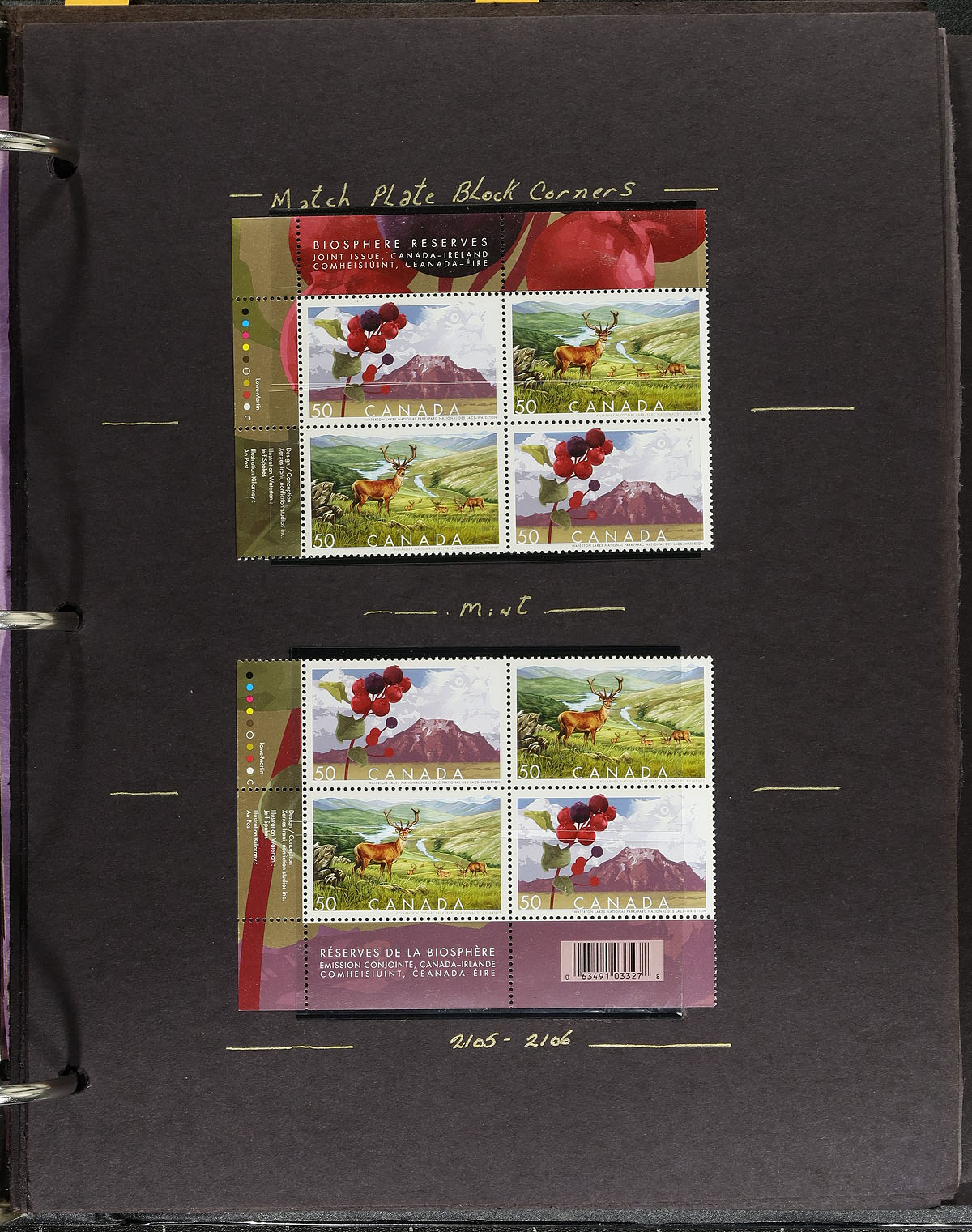 In-depth collection of primarily mint never hinged Canada, from January to May of 2005, covering Unitrade #s 2083-2108, all in hingeless mounts in over 50 well described pages, housed in a thick binder. The collection contains mint and used singles (including booklet stamps), multiples, matched set of plate blocks (including used sets), for some issues, along with a few souvenir sheets and sheetlets (mint and used), booklets (including used booklet panes), and first day covers. We note several match sets cataloguing $10.00 and up. Face value alone totals $209.00. A nice comprehensive collection that would be difficult to duplicate. 2024 Unitrade =