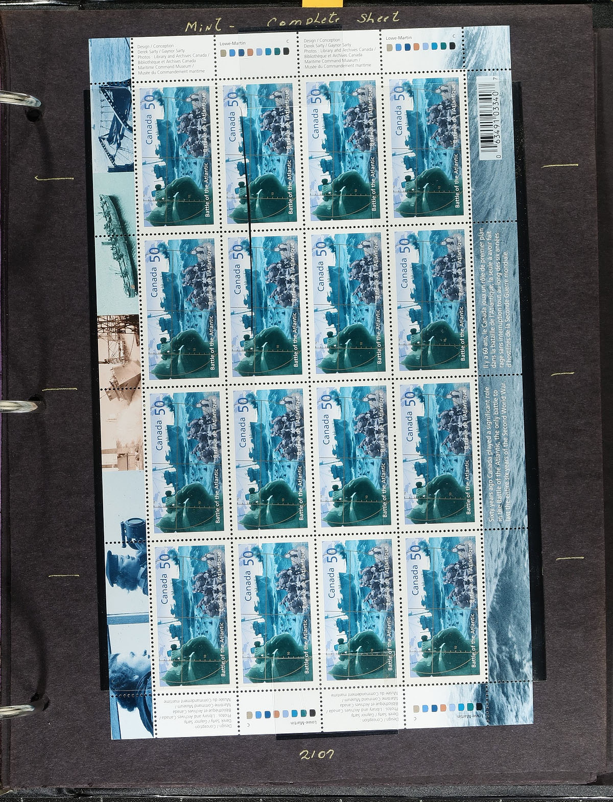 In-depth collection of primarily mint never hinged Canada, from January to May of 2005, covering Unitrade #s 2083-2108, all in hingeless mounts in over 50 well described pages, housed in a thick binder. The collection contains mint and used singles (including booklet stamps), multiples, matched set of plate blocks (including used sets), for some issues, along with a few souvenir sheets and sheetlets (mint and used), booklets (including used booklet panes), and first day covers. We note several match sets cataloguing $10.00 and up. Face value alone totals $209.00. A nice comprehensive collection that would be difficult to duplicate. 2024 Unitrade =