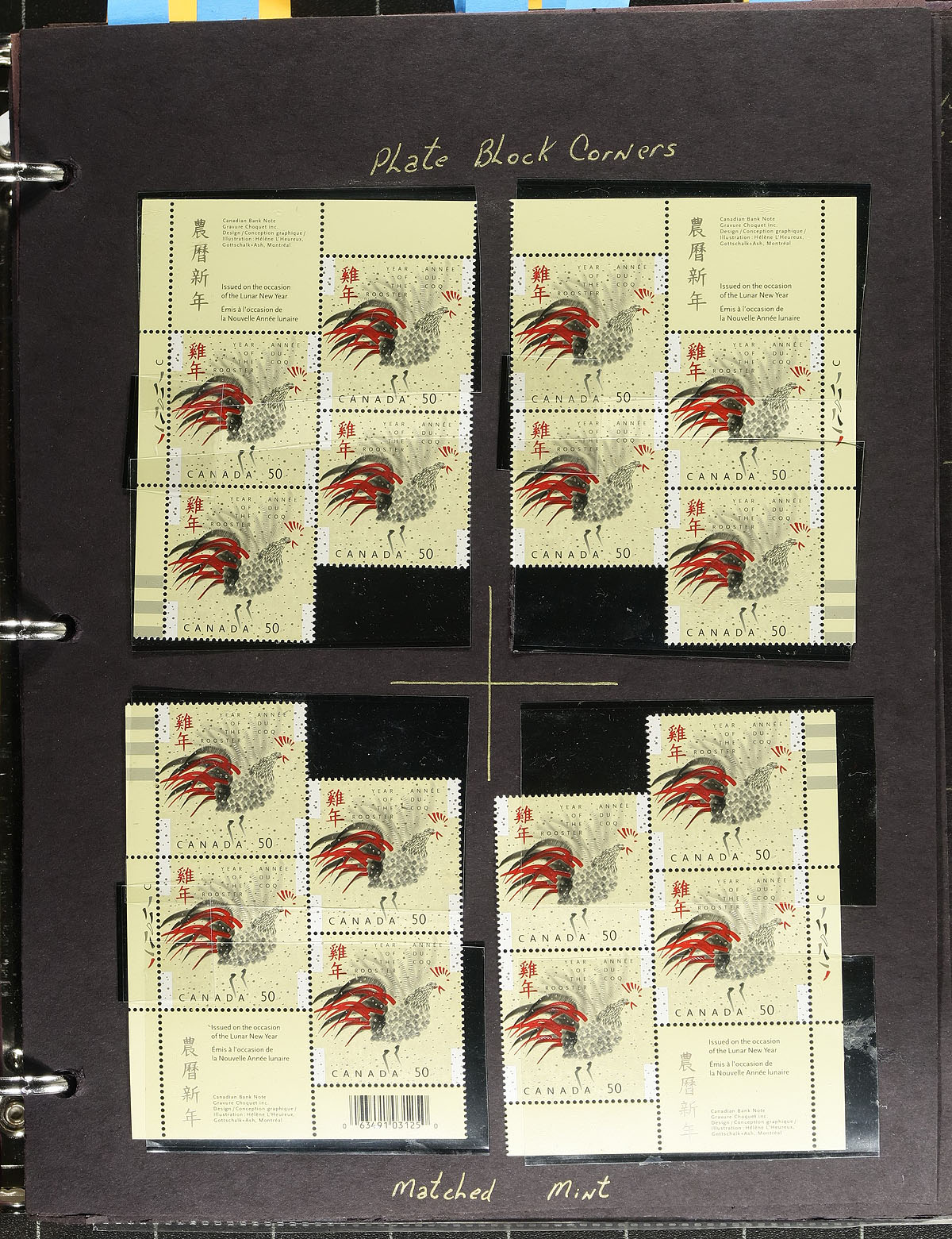 In-depth collection of primarily mint never hinged Canada, from January to May of 2005, covering Unitrade #s 2083-2108, all in hingeless mounts in over 50 well described pages, housed in a thick binder. The collection contains mint and used singles (including booklet stamps), multiples, matched set of plate blocks (including used sets), for some issues, along with a few souvenir sheets and sheetlets (mint and used), booklets (including used booklet panes), and first day covers. We note several match sets cataloguing $10.00 and up. Face value alone totals $209.00. A nice comprehensive collection that would be difficult to duplicate. 2024 Unitrade =
