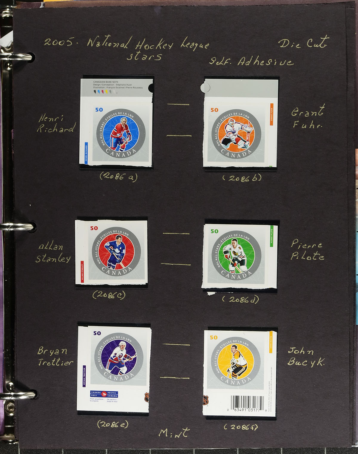 In-depth collection of primarily mint never hinged Canada, from January to May of 2005, covering Unitrade #s 2083-2108, all in hingeless mounts in over 50 well described pages, housed in a thick binder. The collection contains mint and used singles (including booklet stamps), multiples, matched set of plate blocks (including used sets), for some issues, along with a few souvenir sheets and sheetlets (mint and used), booklets (including used booklet panes), and first day covers. We note several match sets cataloguing $10.00 and up. Face value alone totals $209.00. A nice comprehensive collection that would be difficult to duplicate. 2024 Unitrade =