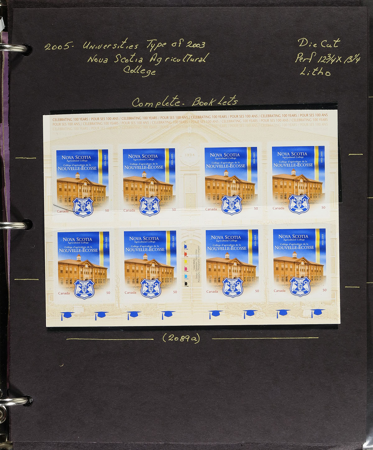 In-depth collection of primarily mint never hinged Canada, from January to May of 2005, covering Unitrade #s 2083-2108, all in hingeless mounts in over 50 well described pages, housed in a thick binder. The collection contains mint and used singles (including booklet stamps), multiples, matched set of plate blocks (including used sets), for some issues, along with a few souvenir sheets and sheetlets (mint and used), booklets (including used booklet panes), and first day covers. We note several match sets cataloguing $10.00 and up. Face value alone totals $209.00. A nice comprehensive collection that would be difficult to duplicate. 2024 Unitrade =