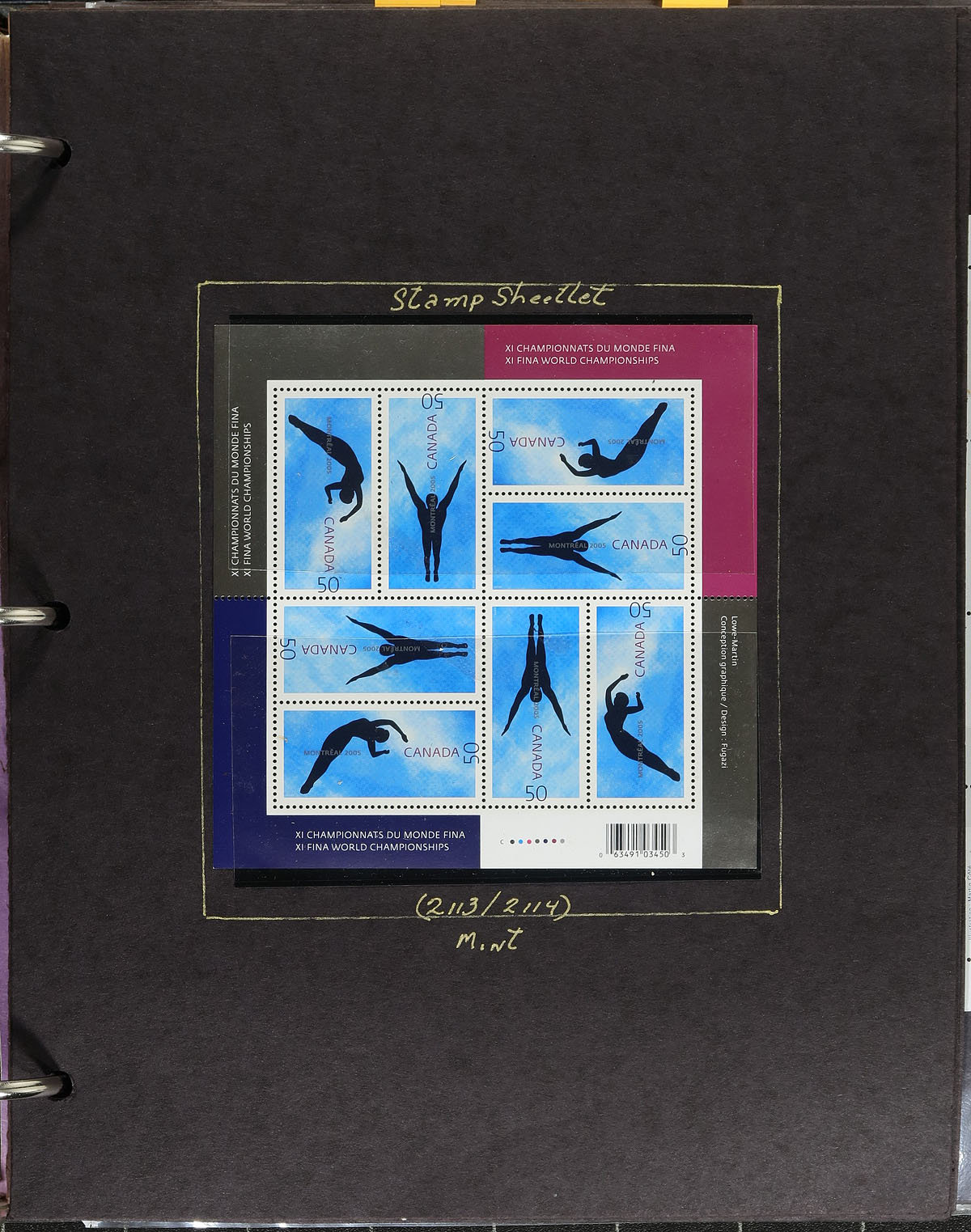 In-depth collection of primarily mint never hinged Canada, from May to December of 2004, covering Unitrade #s 2109-2117, 2122-2139, all in hingeless mounts in over 50 well described pages, housed in a thick binder. The collection contains mint and used singles (including booklet stamps), multiples, matched set of plate blocks (including used sets), for some issues, along with definitive issues, a few souvenir sheets and sheetlets (mint and used), booklets (including used booklet panes), and first day covers. We note several match sets cataloguing $10.00 and up. Face value alone totals $238.00. A nice comprehensive collection that would be difficult to duplicate. 2024 Unitrade =