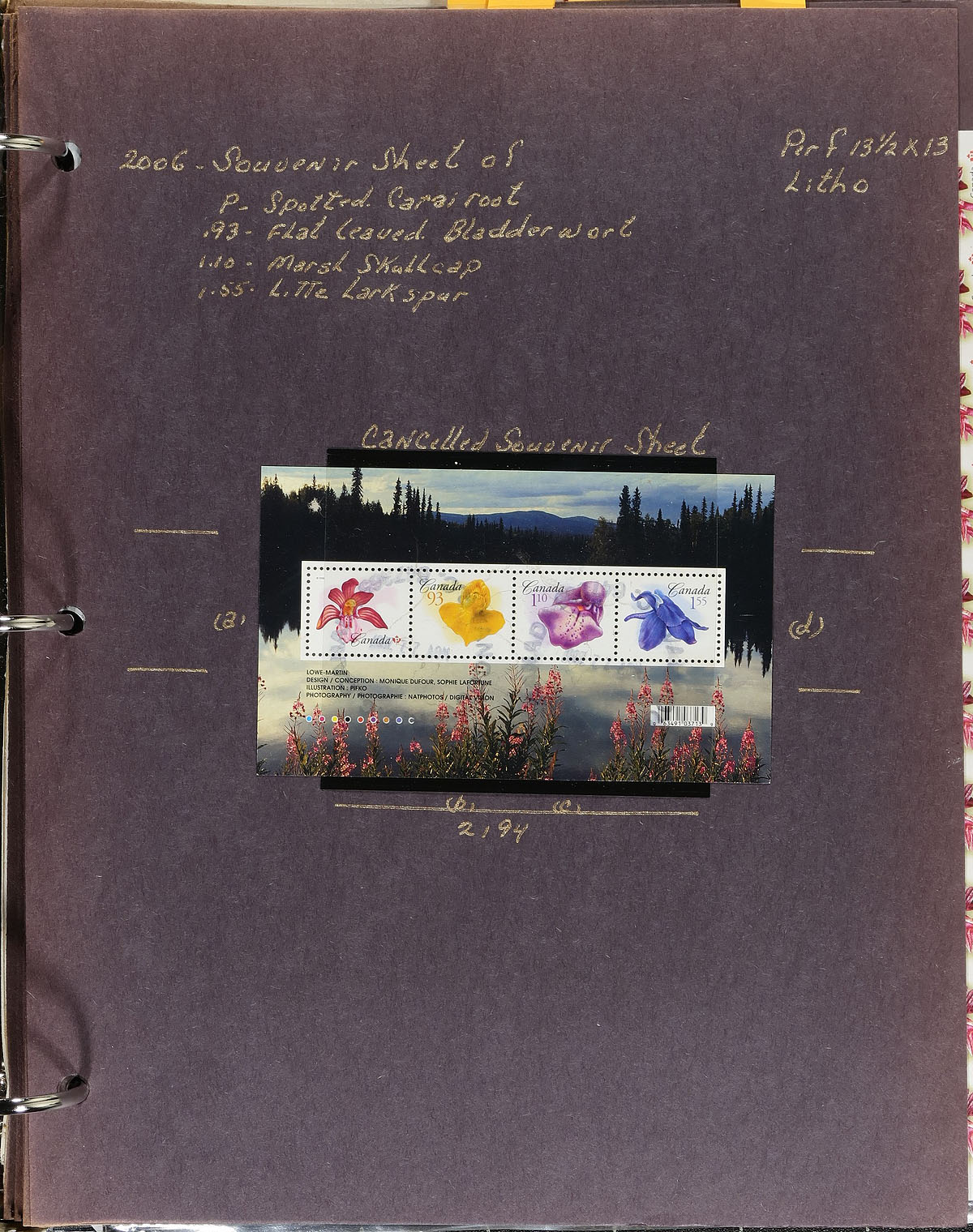 In-depth collection of primarily mint never hinged "Flower" and "First Class" definitives, 2006, covering Unitrade #s 2187-2200, all in hingeless mounts in over 50 well described pages, housed in a binder. The collection contains mint and used singles (including booklet stamps), booklets, mint and used souvenir sheets, coil singles, pairs, and strips of 4, along with roughly 30 first day covers (appearing to have Lower Mainland B.C. postmarks from a variety of outlets). We note some better items cataloguing $15.00 and up, including #2187 coil uncut press panel of 100 (c.v. $170.00). Face value alone totals $283.00 (includes 171x "P" stamps). A nice comprehensive collection that would be difficult to duplicate. 2024 Unitrade =
